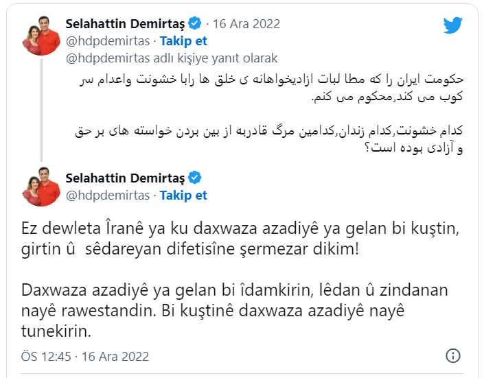 سەلاحەدین دەمریتاش، بە چوار زمانی کوردی، تورکی، فارسی و ئازەری بەهۆی لەسێدارەدانی چالاکوانانەوە، حکومەتی ئێرانی ئیدانە کرد. سەلاحەدین دەمیرتاش هاوسەرۆکی پێشووی پارتی دیموکراتی گەلان (هەدەپە)، تویتێکی لەبارەی دەستگیرکردن، کوشتن و لەسێدارەدانی چالاکوانان لە ئێران بڵاوکردەوە. دەمیرتاش تویتەکەی بە چوار زمانی، کوردی، تورکی، فارسی و ئازەری، تویتەکەی بڵاوکردەوە و دەڵێت، " من دەوڵەتی ئێران ئیدانە دەکەم کە دەیەوێت ئازادی گەلان بە کوشتن، دەستگیرکردن و لەسێدارەدان زەوت بکات! داواکاری ئازادی گەلان بە سێدارە، لێدان و زیندان، راناگیرێت. بە کوشتنی داواکاری ئازادی لەناونابریت. خۆپیشاندانەکانی ئێران و رۆژهەڵاتی کوردستان، ئەمڕۆ ١٦ی کانونی یەکەم، سێ مانگی تەواو کرد کە ١٦ی ئەیلولی ئەمساڵ دەستی پێکرد. بەگوێرەی ئامارە فەرمیەکان تاوەکو ئێستا ٤٥٠ کەس کوژراون، بە هەزاران کەسیش بریندار و دەستگیرکراون. تاوەکو ئێستا دوو گەنجی چالاکوان لەسێدارەدراون، سزای لەسێدارەدان بەسەر ١١ کەسدا سەپێنراوە و دۆسیەی لەسێدارەدانی ٢٥ کەسی دیکەش لە دادگاکانە.