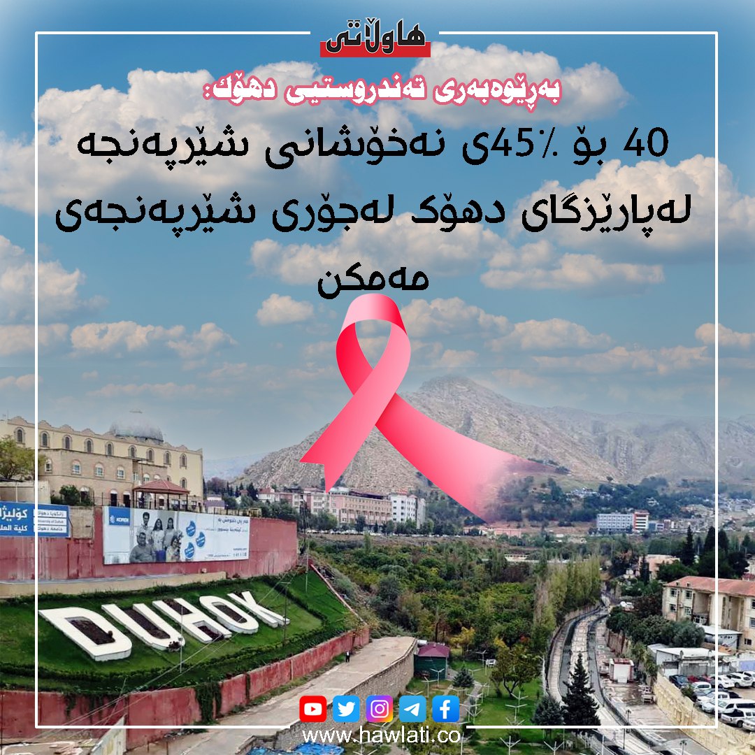هاوڵاتی بەڕێوەبەری تەندروستیی دهۆك: 40 بۆ 45٪ی نەخۆشانی شێرپەنجە لەپارێزگای دهۆك لەجۆری شێرپەنجەی مەمكن. د.ئەفراسیاب موسا، بەڕێوەبەری گشتیی تەندروستیی دهۆك بەهاوڵاتی راگەیاند:» بەشێكی زۆری ئەو نەخۆشانەی سەردانی ناوەندە پزیشكییەكان دەكەن و تووشی نەخۆشی شێرپەنجە بوون، تووشی شێرپەنجەی مەمك و شێرپەنجەی خوێن بوون، 40 بۆ 45٪ی نەخۆشانی شێرپەنجە لەپارێزگای دهۆك لەجۆری شێرپەنجەی مەمكن». وتیشی: «لەدهۆك دوو ناوەند بۆ پشكنین و چارەسەری نەخۆشانی شێرپەنجە هەیە، كەئەوانیش ناوەندێك لەنەخۆشخانەی ئازادی كە 75 قەرەوێڵەیە، هەروەك سەنتەری شێرپەنجەی منداڵان و نەخۆشانی تالاسیما لەپارێزگای دهۆك».