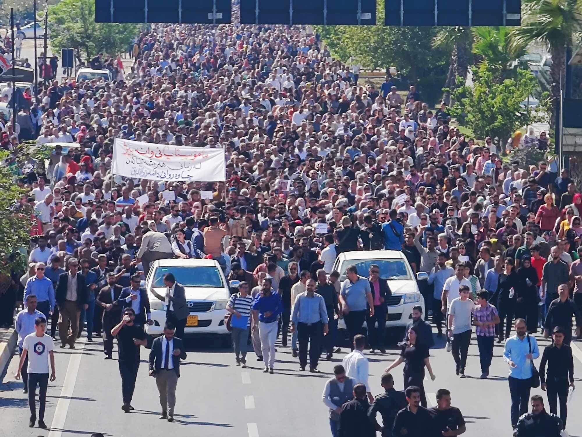 هاوڵاتی دواى فەرمانەکەى وەزارەتى پەروەردە بۆ دەستپێکردنەوەى دەوام قوتابخانەکان، ئەمڕۆ یەکشەممە خۆپیشاندانى مامۆستایان و فەرمانبەران لە سنورى پارێزگاى سلێمانى و هەڵەبجە و کۆیە و رانیە و قەڵادزێ و چەمچەماڵ بەردەوامى هەیە و بەشێک لە چین و توێژەکانى دیکە هاوشان لەگەڵ مامۆستایانى ناڕازى و وانەبێژان بەشدارییان کردووە. بهیانی ئهمڕۆ یهكشهممه جارێكی دیكه مامۆستایانی میلاك و مامۆستایانی وانهبێژ و سهدان فهرمانبهر و چالاكوانی دیكه له سلێمانی خۆپیشاندانی فراوانیان ئهنجامدا و دوای داخستنی شهقامی سالم بهرهو بهڕێوهبهرایهتی پهروهردهی سلێمانی رۆیشتن، ئهوان دروشمی بهردهوامی بایكۆتیان راگهیاند. ئاماژەیان بەوەشکرد، "ئەم بایکۆتە پەیوەندی بە یەک موچەوە نییە، لە ساڵی ٢٠١٤وە پێمان دەوترێت موچە قەرەبوو دەکرێتەوە بەڵام خوێندن قەرەبوو ناکرێتەوە، بەڵام ئێمە لەو کاتەوە ئەو قەرەبووەمان نەبینی." مامۆستایەکیش باسی لەوەکرد، "شەرمە بۆ حکومەتێک سەرجەم مافەکانی مامۆستایانی پێشێل کردبێت و بە وشەی "دەبێت" مامەڵەیان لەگەڵدا بکات." مامۆستایەکیدیکەش ڕایگەیاند، "رێگه نادهین وهزیری پهروهرده ههڕهشهمان لێبكات و پێمان بڵێت، دهبێت بگهڕێنهوه هۆڵهكانی خوێندن، ئێمه قبوڵی ناكهین و دهبێت موچهكانمان بدرێتهوه و دهبێت شكۆمان بۆ بگهڕێتهوه، دهبێت تاكۆتایی و بهدهستهێنانی ئامانجهكانمان بهردهوام دهبین له بایكۆت". 19ی ئهم مانگه ئالان حهمهسهعید، وهزیری پهروهردهی حكومهتی ههرێمی كوردستان لە پەیامێکدا ڕایگەیاند، دڵیان لای مامۆستایان و خوێندكارانه بهڵام ئهو دۆخه گشتییه و تهنها وهزارهتی پهروهرده نییه و داوا دهكهن ههموان بچنه ژێرباری ئهوهوه كه له ههفتهی ئایندهوه "بهرپرسیارێتی گهوره "تهحهمول بكهین، وتیشی، "فهرمانێكی وهزاری واژكردوهكه دهبێت رۆژی 22ی 10 دهبێت مامۆستایان پڕۆسهی خوێندن دهستپێبكهن"، بهڵام لهوهڵامی ئهو پهیامهدا ئهمڕۆ جارێكی دیكه جهخت له بهردهوامی بایكۆت كرایهوه.