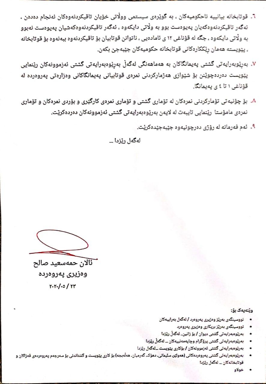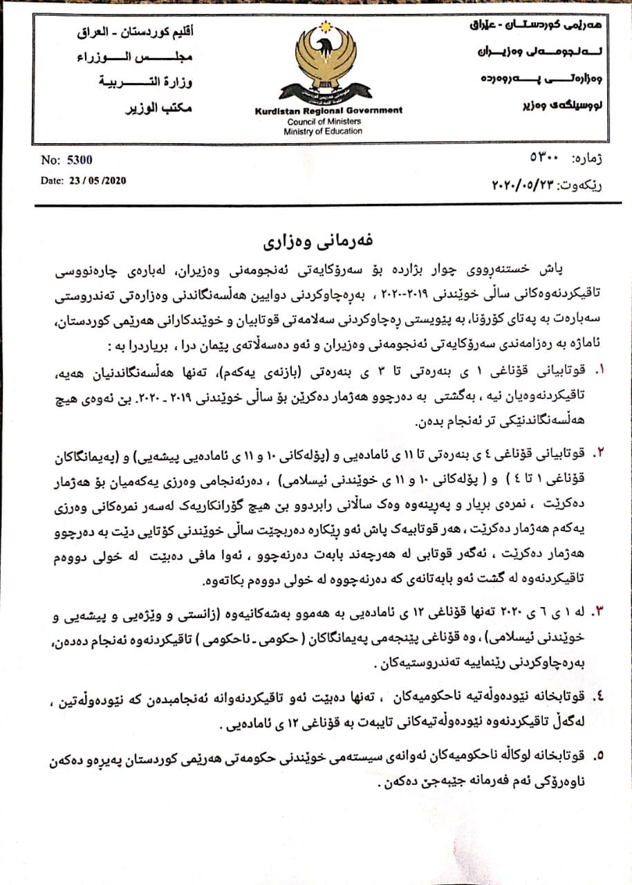 وهزارهتى پهروهرده ئهمرۆ شهممه، 23ئایارى 2020 له راگهیاندراوێکدا رایگهیاند" دوای خستنهڕووی چوار بژارده بۆ حكومهت و به رهچاوكردنی دواین راپۆرتی پزیشكی وهزارهتی پهروهرده ژمارهیهك بڕیاری دهركرد".