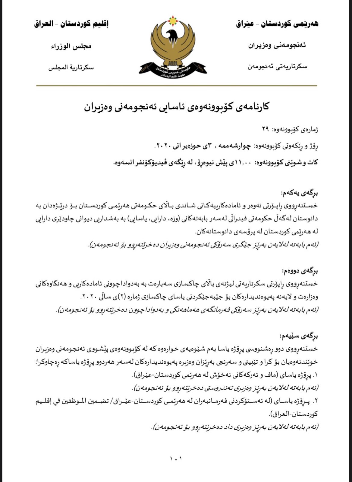 وەزارەتی دارایی کارنامەی کۆبوونەوەی ئاسایی ئەنجومەنی وەزیرانی لە 3/6/2020 لەگەڵ روونكردنەوەكە بڵاوكردووەتەوە. ئەمەی خوارەوە دەقی كارنامەی كۆبوونەوەكەیە:.