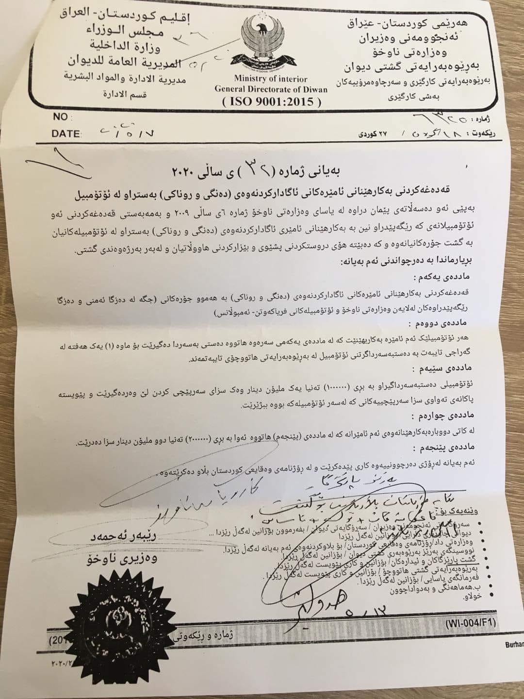 له بهیاننامهكهدا كه واژۆی رێبهر ئهحمهد، وهزیری ناوخۆی حكومهتی ههرێمی كوردستانی لهسهره، هاتووه، ھەر شۆفێرێك ئامێری دەنگی یان روناکی لە ئوتومبێلەکەی ببەستێت سزا دەدرێت بو زانین و ئاگاداریتان.