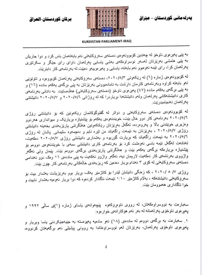 جێگرو سکرتێرى پهرلهمانى کوردستان ئاماژه بۆ ئهوه دهدهن که بڕیارى تهشریعى ژماره (4)ى رێکهوتى 2020/5/7 تهنها بهدهنگى زۆرینهى پهرلهمانى ههڵدهوهشێندرێتهوه.