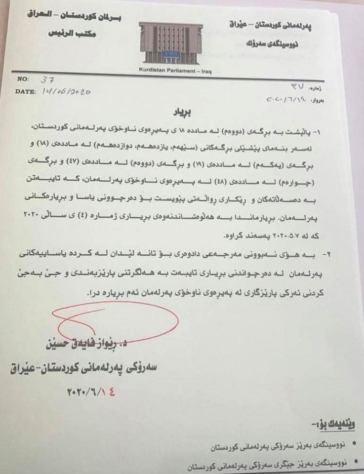 ئهمڕۆ 16ى حوزهیرانى 2020 له ڕونکردنهوهیهکدا که له 10 خاڵ پێکهاتوهو لهبهشێکیدا هاتووه، "ئێمه ئهو بڕیاره بهرایهکى کهسى تاک لایهنهى دادهنێین که هیچ بنهمایهکو بههایهکى یاسایى نیه."