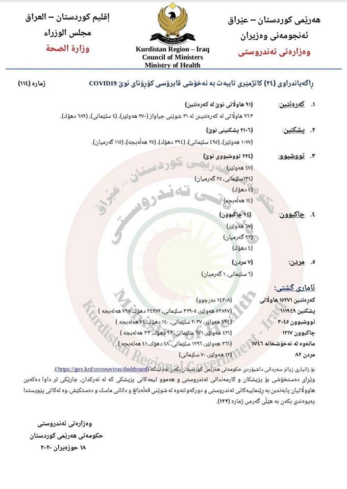 بهپێى راگهیهندراوهکه لهماوهى 24 سهعاتى رابردودا 224 حاڵهتى نوێى توشبون به کۆرۆنا له ههرێمى کوردستان تۆمارکراون که 47 توشبو له پارێزگاى ههولێر، 134 توشبو له سلێمانی، 25 توشبو له گهرمیان، چوار توشبو له دهۆک و 14 توشبوو له ههڵهبجه تۆمارکراون.