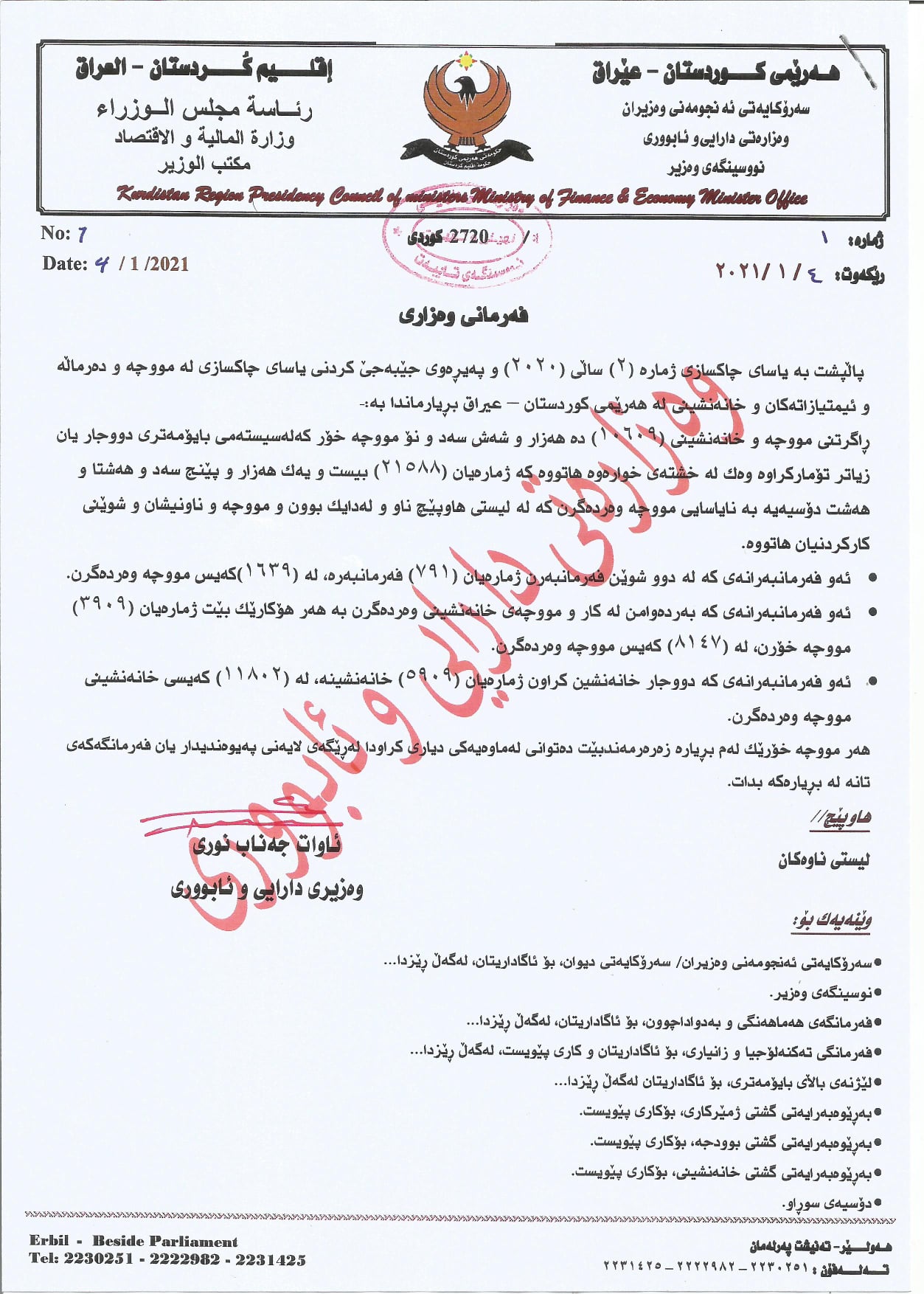 بهپێی نووسراوێكی وهزارهتی دارایی و ئابووری حكومهتی ههرێمی كوردستان، ئهمرۆ دووشهممه، 4کانونى دووهمى2021 بڵاویکردۆتهوه پاڵپشت بە یاسای چاكسازی ژمارە 2 ساڵی 2020 و پەیرەوی جێبەجێ كردنی یاسای چاكسازی لە مووچە و دەرماڵە و ئیمتیازاتەكان و خانەنشینی لە هەرێمی كوردستان بڕیاردرا بە راگرتنی مووچە و خانەنشینی 10 ههزار و 609 مووچە خۆر كە لە سیستەمی بایۆمەتری دووجار یان زیاتر تۆماركراوە وەك لە خشتەی خوارەوە هاتووە كە ژمارەیان (21588) بیست و یەك هەزار و پێنج سەد و هەشتا و هەشت دۆسیەیە بە نایاسایی مووچە وەردەگرن.