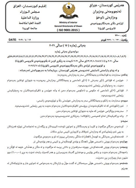 وهزارهتى ناوخۆى ههرێم چهند بڕیارێکى نوێى دهرکرد و تیایدا هاتووه، پڕۆسهى خوێندن له قۆناغى یهکى بنهڕهتى تاوهکو 11ى ئامادهیى به شێوازى ئۆنڵاین بهردهوام دهبێت.