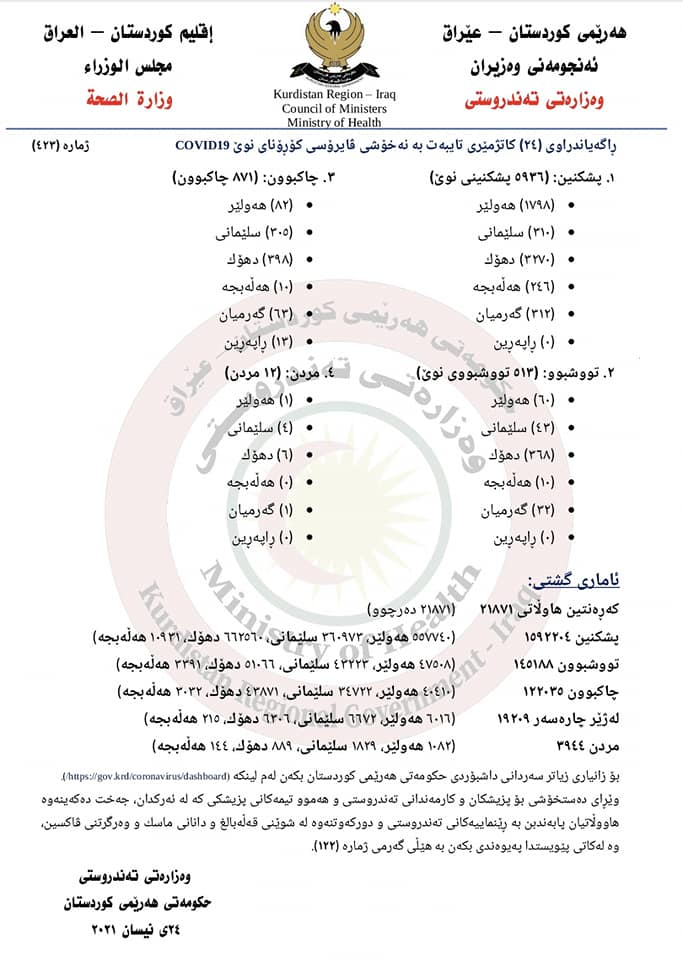 وەزارەتی تەندروستی هەرێمی کوردستان رایگەیاند، لە 24 کاتژمێری رابردودا 513 توشبوی کۆرۆنا تۆمارکراون، 871 توشبو چاکبونەتەوە و 12 توشبو مردون.
