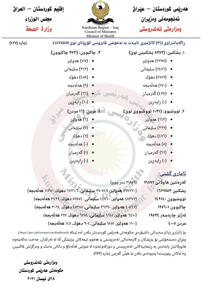 وهزارهتى تهندروستى حکومهتى ههرێمى کوردستان رایگهیاند، له دوێنێوه ههشت ههزار و 352 پشکنینى کۆرۆنا کراون، لهنێویاندا ههزارو 31 کهس وهک توبووى نوێ تۆمار کراون و 973 کهسیش چاکبونهتهوهو 16 دیکه گیانیان لهدهستداوه.