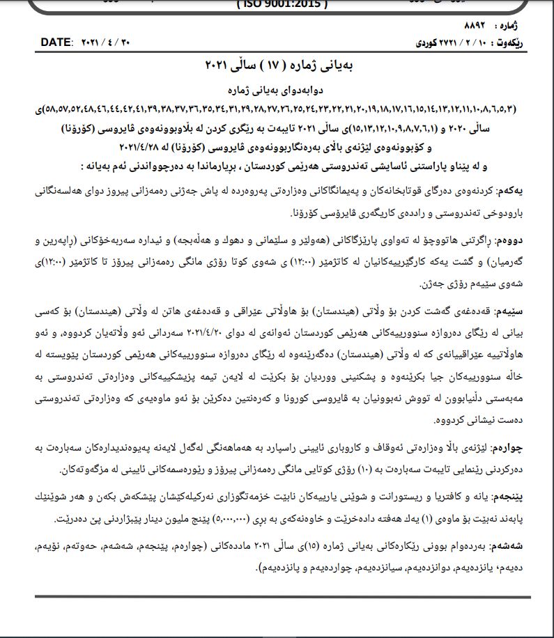 لە راگەیێندراوەکەدا هاتووە، قەدەغەی هاتووچۆ لە تەواوی پارێزگاکانی هەولێر، سلێمانی، دهۆک و هەڵەبجە و ئیدارە سەربەخۆکانی راپەڕین و گەرمیان و گشت یەکە کارگێڕییەکان دوایین شەوی مانگی رەمەزان تاوەکو شەوی سێیەم رۆژی جەژن دەبێت.