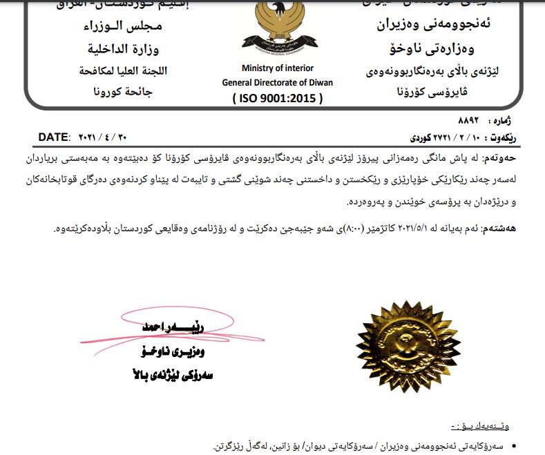 لیژنهی باڵای روبهڕوبونهوهی كۆرۆنا و وەزارەتی ناوخۆ ژمارهیهك بڕیاری نوێی دهركرد.