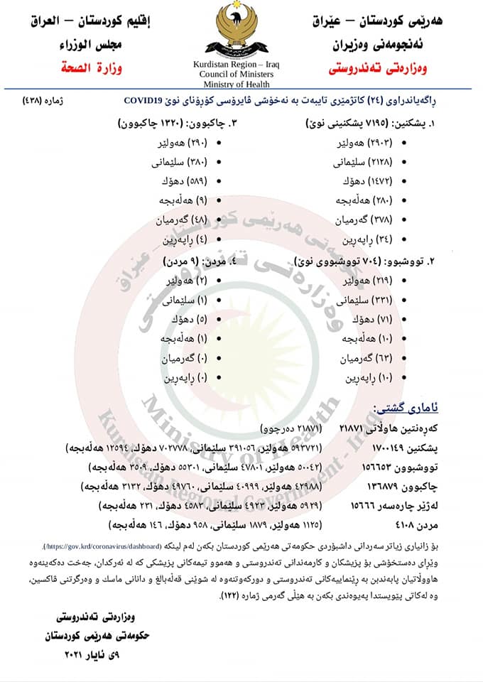 وەزارەتی تەندروستی هەرێمی کوردستان رایگەیاند، لە دوێنێوە 7195 پشکنینی کۆرۆنا کراون، 704 توشبوی کۆرۆنا تۆمارکران و 1320 توشبوش چاکبونەتەوە و 9 توشبوش مردون.