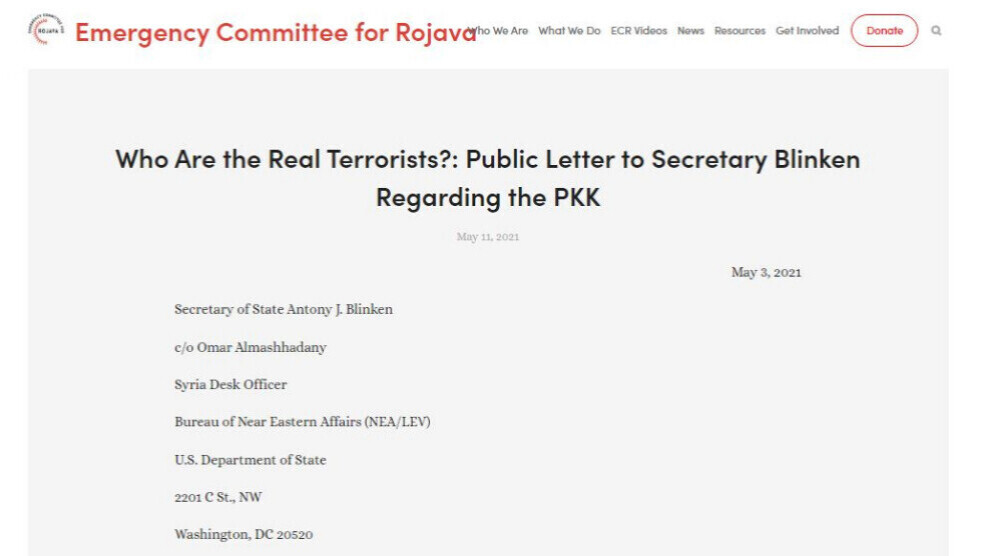 نامهکه به ئیمزاى سهرۆکى کۆمیتهى دۆخى خێرا بۆ رۆژئاوا خاتوو مێردێت تاکس (Meredith Tax)، سکرتێر گشتیى ئهو رێکخراو، خاتوو دیبى بوکچن (Debbie Bookchin) و بهڕێوهبهرى ئیداریى ئهو رێکخراوه خاتوو ئۆزلهم گۆندهر بۆ ئهنتۆنى بلینکن نێردراوه.