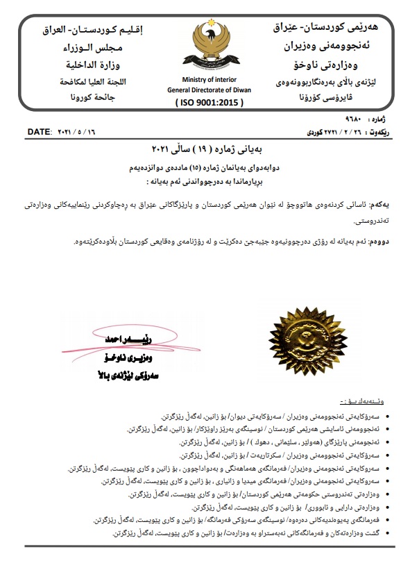 له بهیاننامهیهکدا وهزارهتى ناوخۆى حکومهتى ههرێمى کوردستان بڕیارى نوێى لهبارهى رێنماییهکانى رووبهڕووبوونهوهى پهتاى کۆرۆنا و رێکارهکانى خۆپارێزى دهرکرد که کارئاسانى کردنهوهى هاتووچۆ له نێوان ههرێمى کوردستان و پارێزگاکانى عێراق به ڕهچاوکردنى رێنماییهکانى وهزارهتى تهندروستی جێبهجێ دهکرێت.