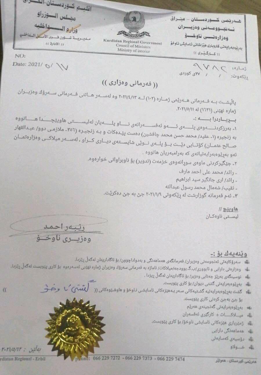 وهزارهتى ناوخۆى ههرێمى کوردستان لهدواین فهرمانیدا که دوێنێ 17ى ئایار بهواژۆى رێبهر ئهحمهد، وهزیرى ناوخۆ دهرچوه ئاماژه بهوهکراوه، دواى رهزامهندى سهرۆک وهزیران بڕیاردراوه به پلهبهرزکردنهوهى 356 ئهفسهر و کارمهندى وهزارهتى ناوخۆ.
