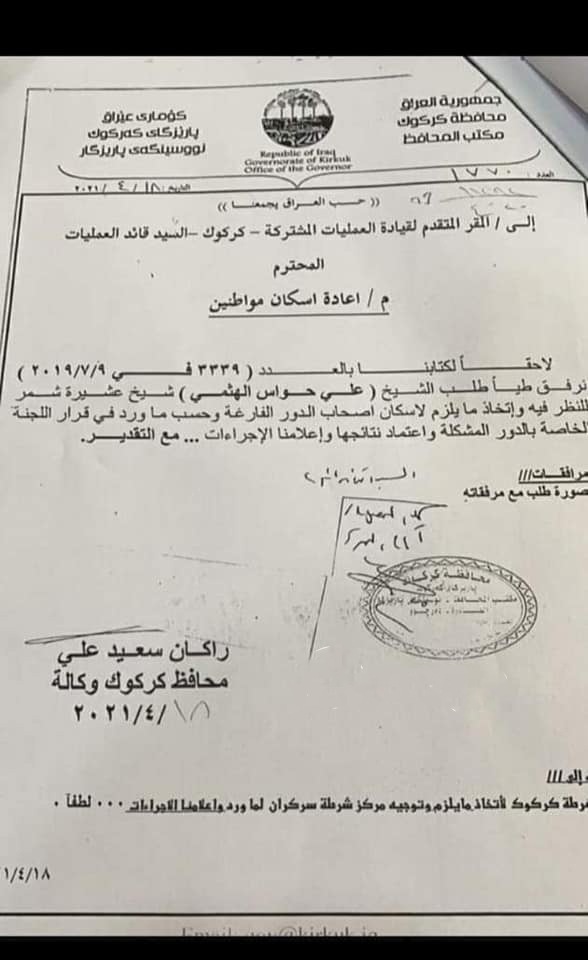 پارێزگارى بهوهكالهتى كهركووك نوسراوێكى كردووه بۆنیشتهجێكردنى عهرهبى هاورده له خانووى كوردهكان له گوندى پهلكانه.