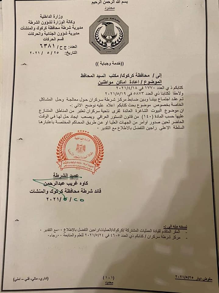 ئەمڕۆ پێنج شەممە، 27 ئایاری 2021 بهڕێوهبهرى پۆلیسى كهركوكی له نوسراوێكدا بڕیارهكه رهتدهكاتهوه و رایدهگهیهنێت، ئهو بڕیاره جێبهجێناكرێت لهبهر ئهوهى پێچەوانەی بڕیاری ماددەی 140، پێویستە دادگاکان ئەوە یەکلایی بکەنەوە.