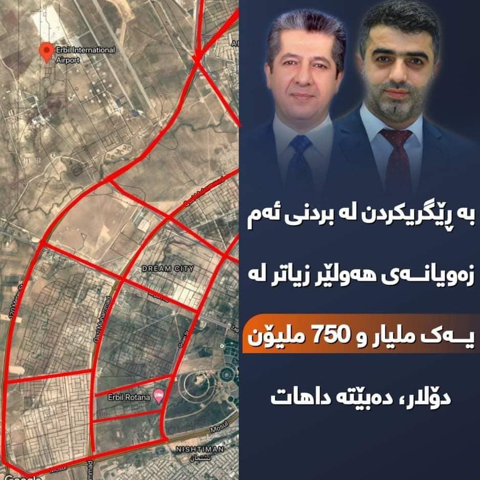 ههروهها راشیگهیاندوه له فڕۆکهخانهى ھهولێرهوه بۆ سهر شهقامى 100 مهترى بهلاى چهپدا، لهسهر شهقامى 100 مهترى به ئاراستهى شهقامى گوڵان بۆ لاى پارک، زهویه بهتاڵهکان و پرۆژه تهوانهکراوهکانى نێوان پارک ھهتا شهقامى 100 مهتری، زهویهکانى دریم ستى به ھهردو ئاراستهى شهقامى 40 مهترى بۆ 100 مهتری، پاشان ئهو زهویانهى له ھهردولاى چهپ و ڕاستى ڕێگاى موسڵن له نێوان شهقامى 40 مهترى بۆ 120 مهتری، بهشێکیان به نایاسایى تاپۆ کراون، واته: بهبێ ئهوهى ھیچ کارى تێدا بکرێت کراوهته موڵکى تهواو، لهوانه: 200 دۆنم له پشت ھۆتێل ڕۆتانا، 80.000 ههزار نزیک نهتهوه یهکگرتوهکان.