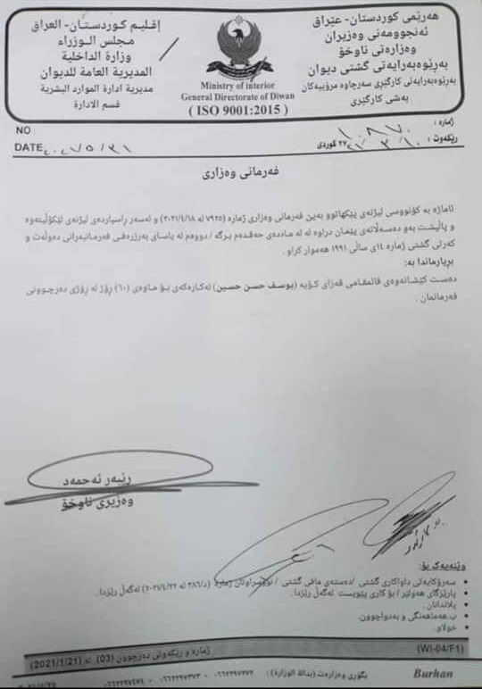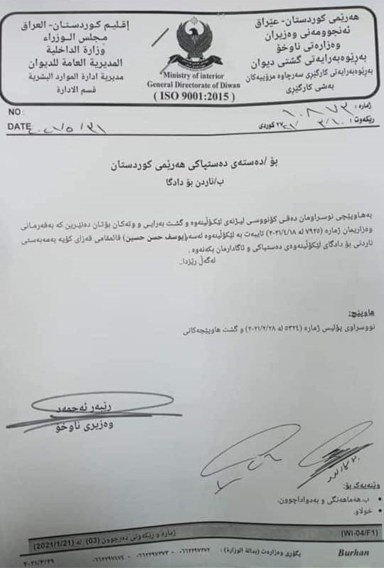 لە نووسراوەکەدا هاتووە: "هاوپێچ لەگەڵ دەقی کۆنووسی لیژنەی لێکۆڵینەوە و گشت بەرایی و وتەکان بۆتان دەنێرین کە فەرمانی وەزاریمان بە ژمارە7925 لە 18/4/2021 تایبەت بە لێکۆڵینەوە لەسەر (یوسف حەسەن حوسێن) قایمقامی قەزای کۆیە بە مەبەستی ناردنی بۆ دادگای لیکۆڵینەوەی دەستپاکی".