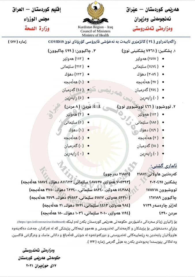 ئهمڕۆ پێنجشهممه 17ى حوزهیرانى 2021، وهزارهتى تهندروستى حکومهتى ههرێم له راگهیهندراوێکیدا تایبهت به کۆرۆنا، ئاماژهى بهوهشکردووه که حهوت ههزارو 361 پشکنینى کۆرۆنا کراون و 446 تووشبووى نوێ تۆمار کراوهو 499 توشبوش چاکبونهوه.