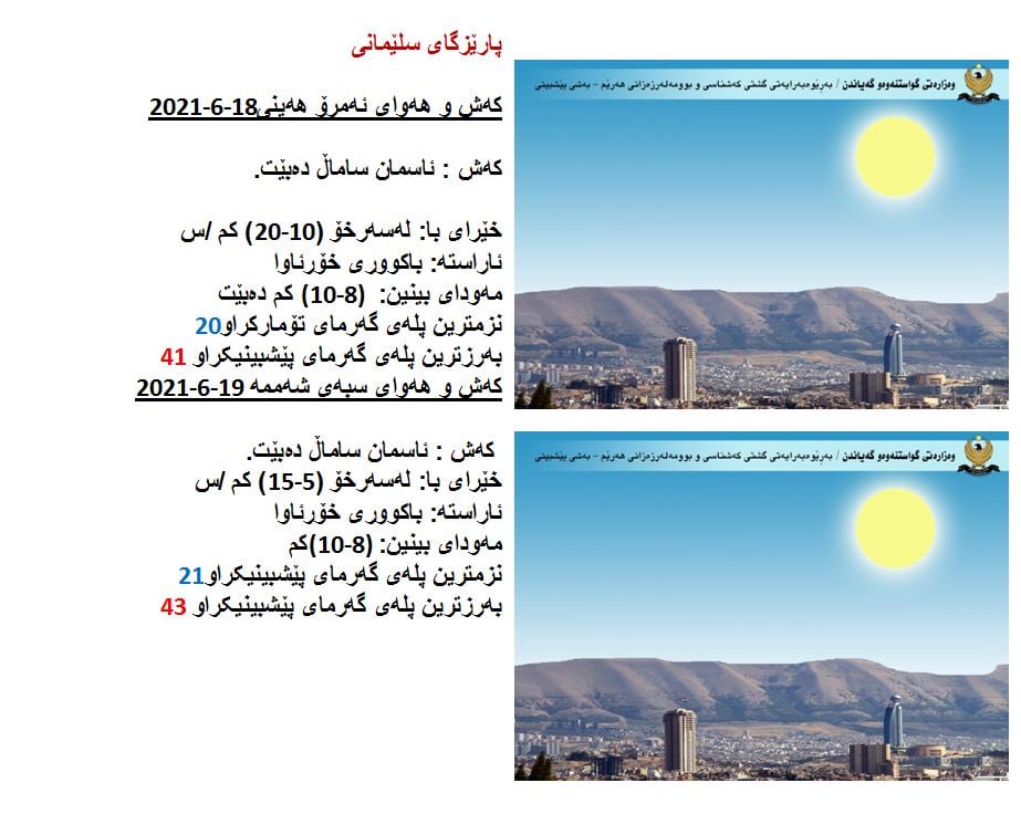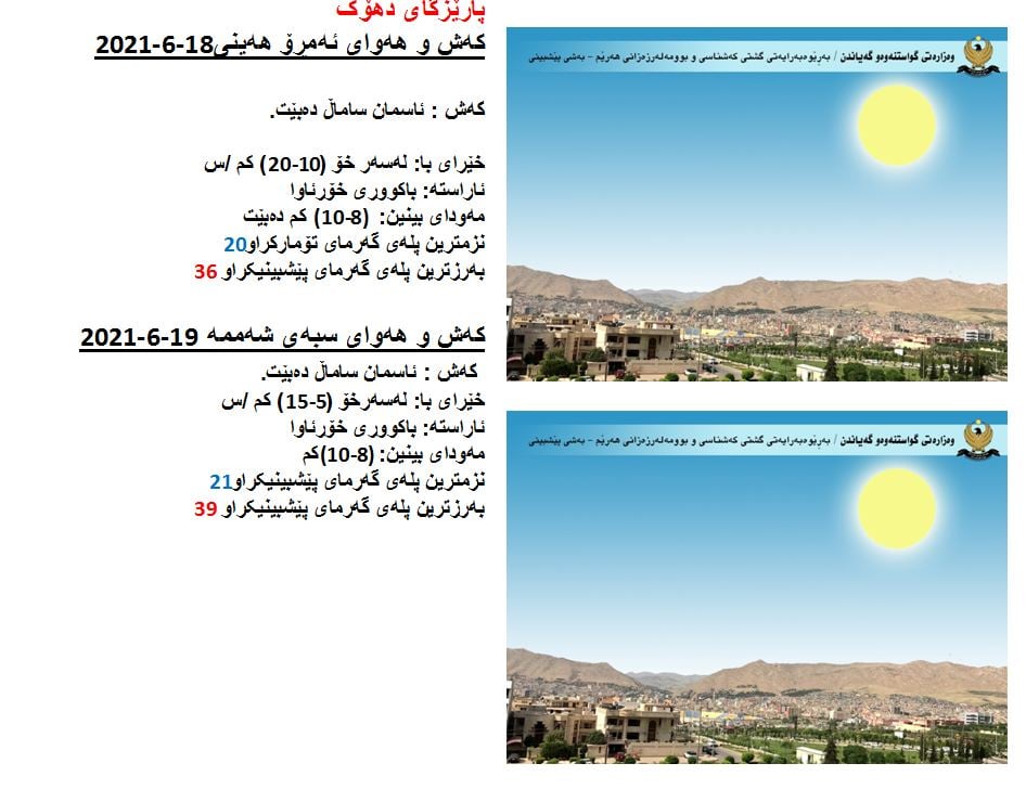 بهڕێوهبهرایهتى گشتى کهشناسى و بوومهلهرزهى ههرێم پێشبینى کهشوههواى ئهمڕۆ ههینى و سبهینێ شهممهى راگهیاند تێیدا ئهوه خراوهتهروو به راورد به پلهى گهرماى ئهمڕۆ سێ پله بهرزدهبێتهوهو ههندێک پارێزگاى ههرێم چهند پلهیهک دهچنه سهرو 40 پلهوه.