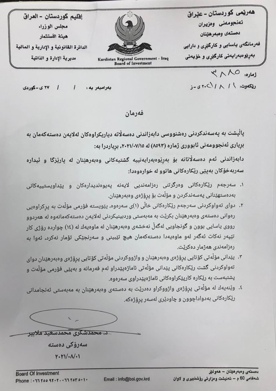 بهپێی نووسراوێك دەستەی وەبەرهێنان دەسەڵاتەکانی بۆ بەرێوەبەرایەتییە گشتییەکانی وەبەرهێنان شۆڕ كراوهتهوه.