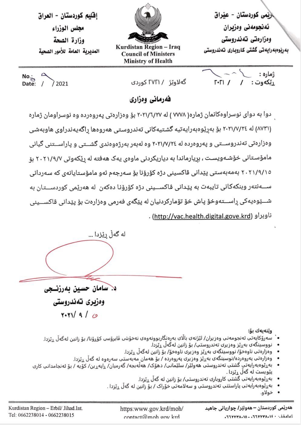 وەزارەتی تەندروستی هەرێمی کوردستان رایگەیاند:" بڕیاریان داوە بە دیاریکردنی ماوەی یەک هەفتە لە رێککەوتی 7 تاوەکو 15ی ئەیلوول بەمەبەستی پێدانی ڤاکسینی دژە کۆرۆنا بۆ سەرجەم ئەو مامۆستایانەی سەردانی سەنتەر و بنکەکانی تایبەت بە پێدانی ڤاکسین دەکەن بەشێوەیەکی راستەوخۆ پاش خۆتۆمارکردن.
