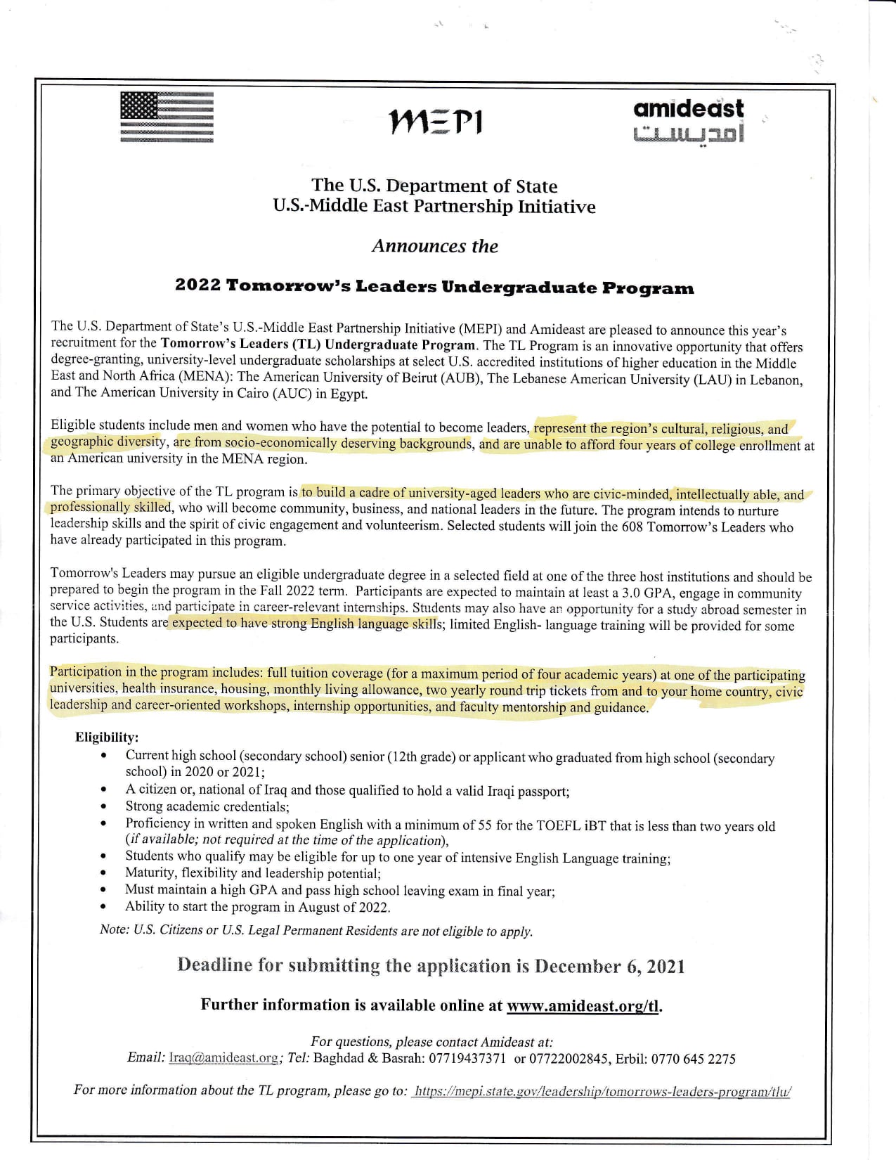 ئەمڕۆ سێشهممه 28ی ئهیلوولی 2021، بەپێی نووسراوێکی بەڕێوەبەرایەتی پلاندانانی پەروەردەیی لە وەزارەتی پەروەردەی هەرێمی کوردستان کە ژمارە 17038ی پێدراوە و لە رۆژی 27ی ئەیلوولی 2021 دەرچووە و ئاراستەی بەڕێوەبەرایەتییە گشتییەکانی پەروەردەکانی هەولێر، دهۆک، سلێمانی، هەڵەبجە، گەرمیان و کەرکوک - بەشی خوێندنی کوردی کراوە، کۆنسوڵخانەی ئەمریکا لە هەولێر لە رێگەی پرۆگرامی دەستپێشخەریی هاوبەشی رۆژهەڵاتی نێوەڕاست (MEPI)، دەرفەتی خوێندنی بەکالۆریۆس بۆ دەرچووانی پۆلی 12ی ئامادەیی لە چەند زانکۆیەکی ئەمریکی لە رۆژهەڵاتی نێوەڕاست لەژێر ناونیشانی "Tomorrow’s Leaders (TL) Undergraduate Program"دەڕەخسێنێت.