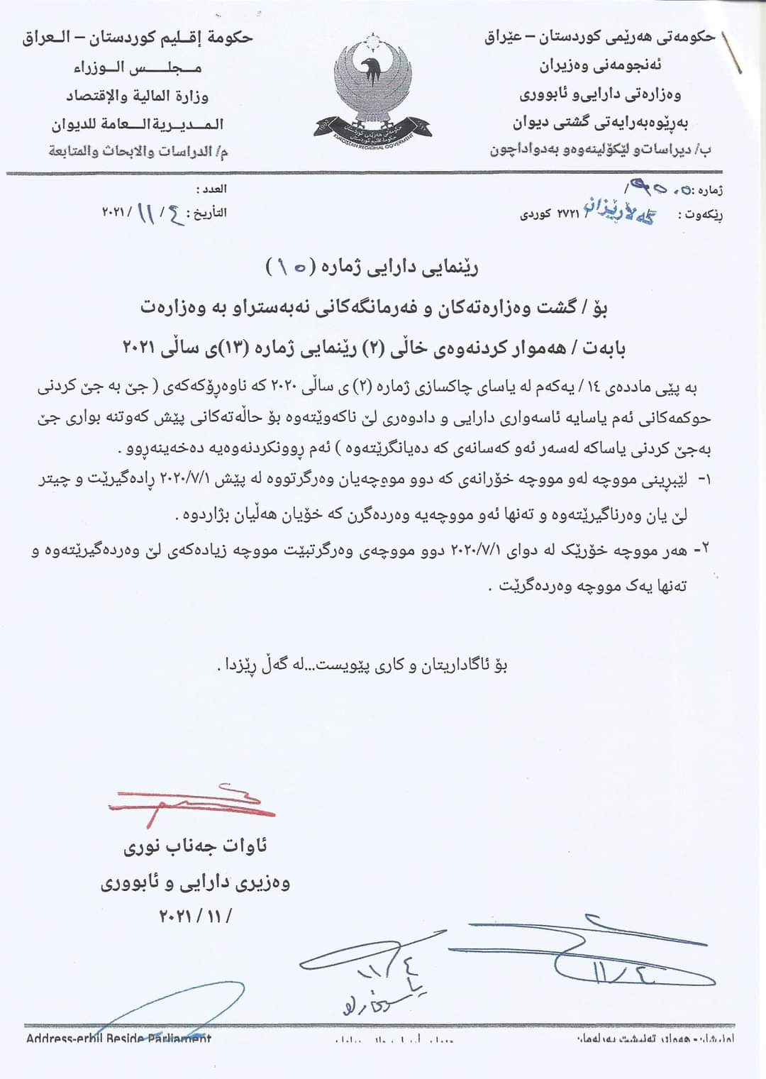 ئەمڕۆ پێنجشەممە، 4ی تشرینی دووهمی 2021، وەزارەتى دارایى و ئابورى حکومەتى هەرێمى کوردستان رێنماییەکى ئاڕاستەى گشت وەزارەتەکان و فەرمانگەکانى نەبەستراو بە وەزارەتەکان کرد و رایگەیاند، لێبڕینى مووچە لەو مووچەخۆرانەى کە دوو مووچەیان وەرگرتووە لەپێش 1-7-2021 لێیان وەرناگیرێتەوە، بەڵام ئەوانەى دواى ئەو بەروارە لێیان وەردەگیرێتەوە.