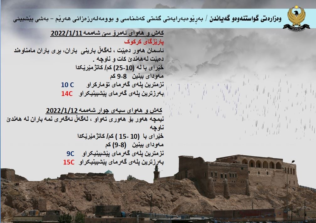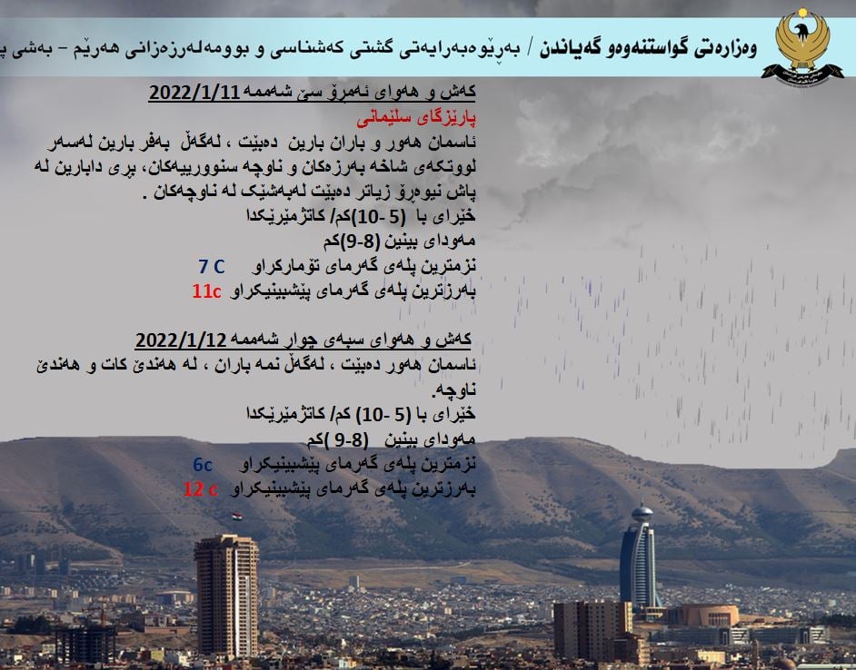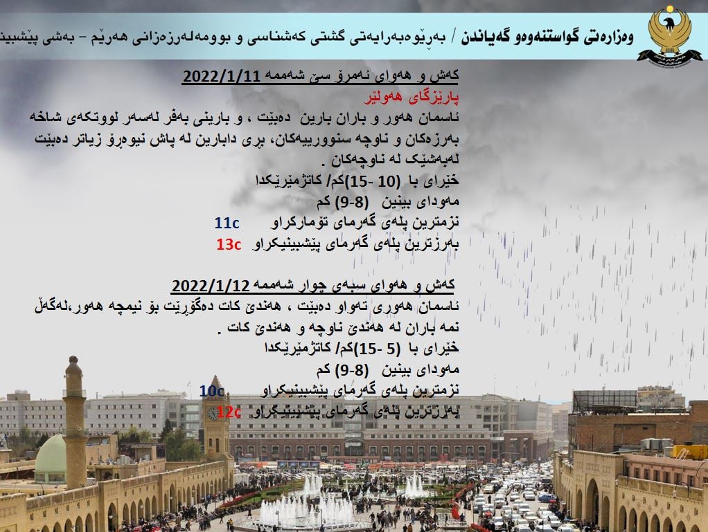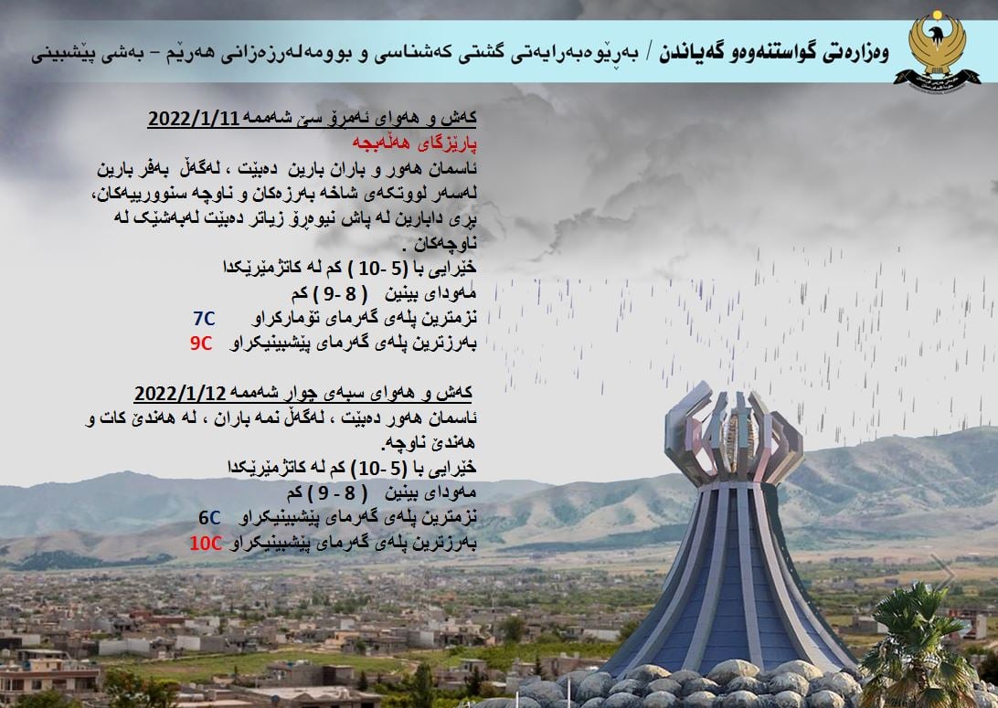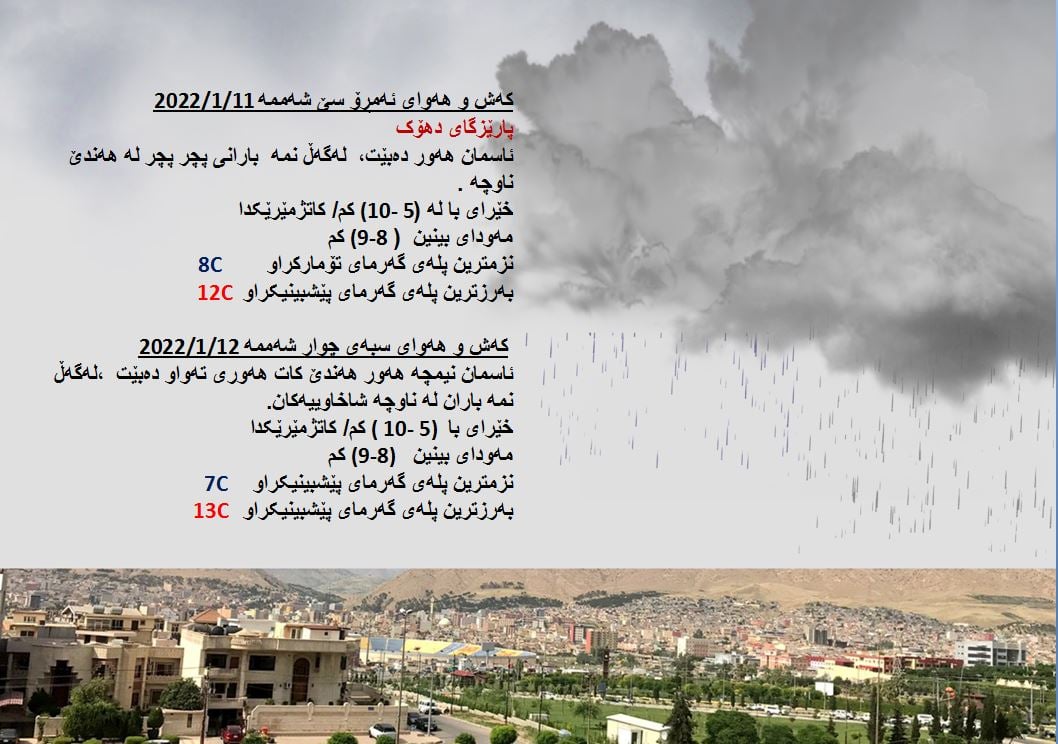 بەپێی پێشبینییەكانی بەڕێوەبەرایەتی گشتی كەشناسی و بوومەلەرزەزانی هەرێمی كوردستان، ئەمڕۆ سێشەممە 11ی كانونی دووەمی 2022ئاسمان هەورو بارانبارین دەبێت، لەگەڵ بەفربارین لە شاخەكان و ناوچە سنوریەكان، دوای نیوەرۆ بەفرزیاتر دەباریت.