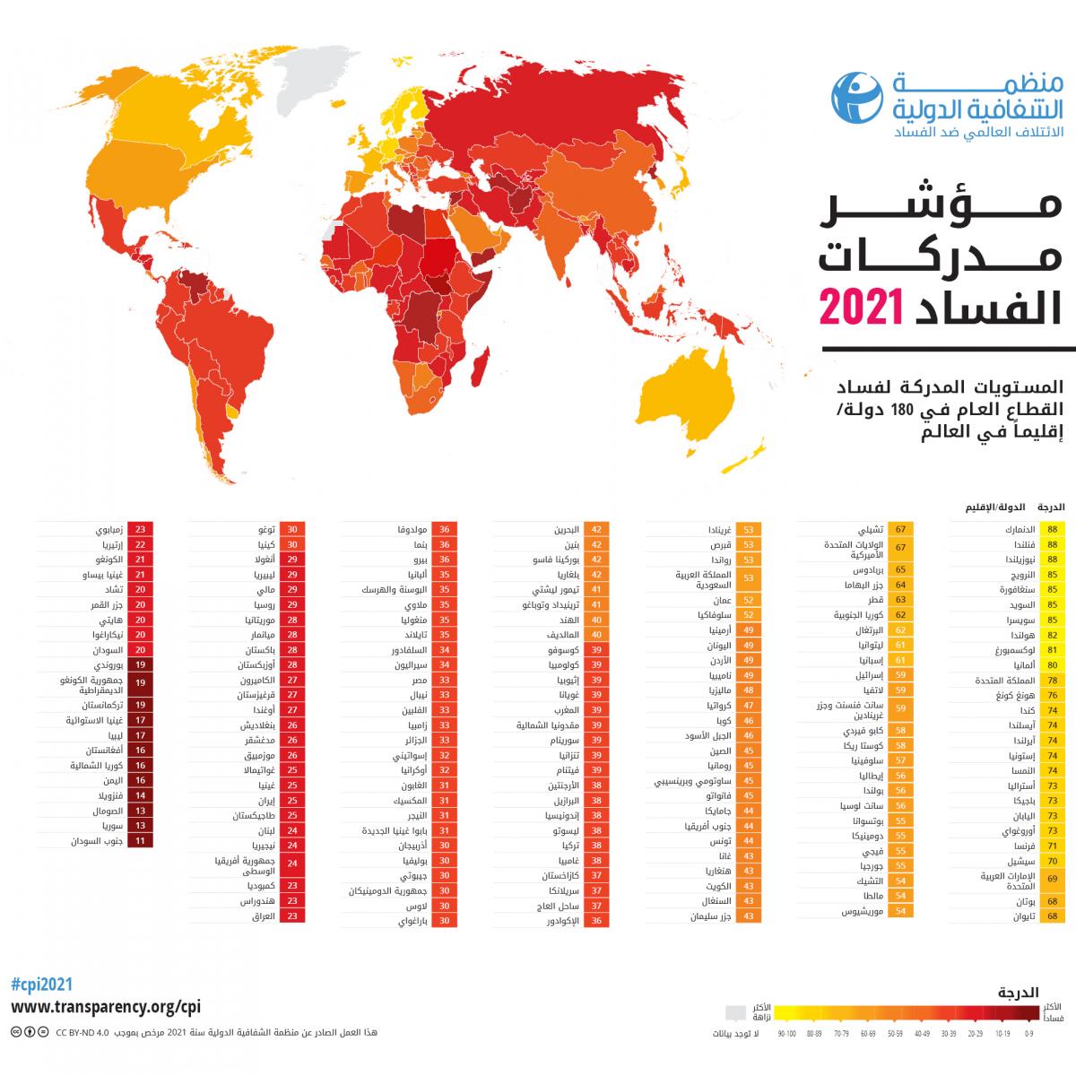 ریزبەندییەکە بەسەر ئاستی یەکەم (88) پلە ، ئاستی دوەم 86 پلە دابەشکراوە و 20 وڵاتیش کەوتونە دەرەوەی ریزبەندییەکە و بە گەندەڵترین وڵاتانی جیهان دیاریکراون، لەریزبەندییەکەدا ئیمارات یەکەم وڵاتی عەرەبییە لەڕوی شەفافیەت و لەپلەی 24 دێت لەئاستی جیهان، دوای ئەویش قەتەر دوەم وڵاتی عەرەبییە و لەپلەی 31 دێت.