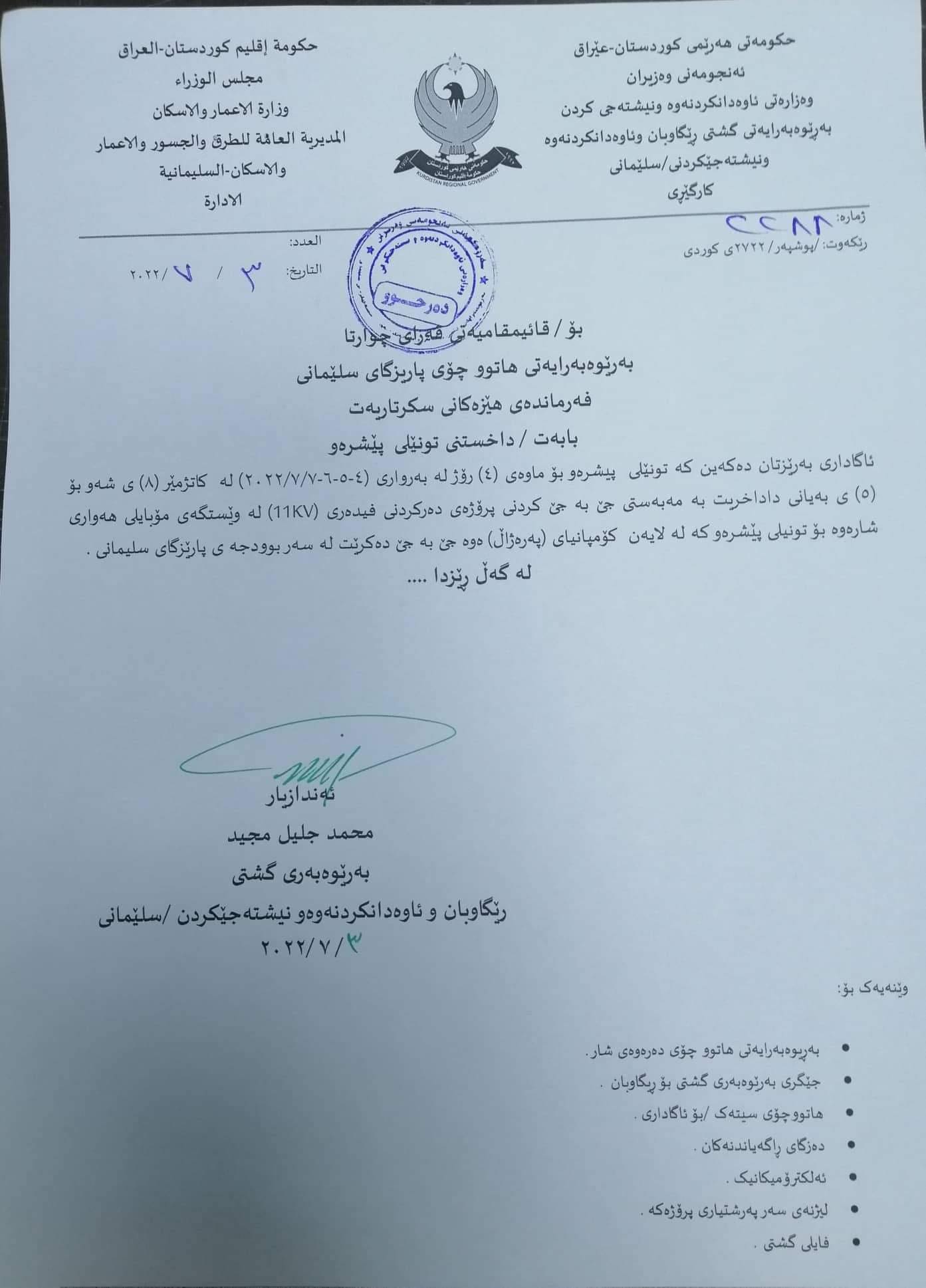 هاوڵاتی بەرێوەبەری گشتی رێگاوبان و ئاوەدانكردنەوەو نیشتەجێكردنی سلێمانی ئەوە دەخاتەروو بەهۆی گواستنەوەی پڕۆژەی فیدەری (11 kv) لەوێستگەی مۆبایلی هەواری شارەوە بۆ تونێلی پێشڕەو.