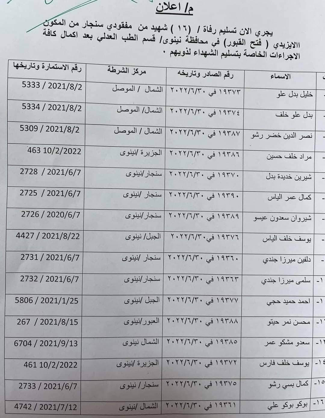ئەمڕۆ 24ی تشرینی یەکەم ،پزیشکی دادی بەغدا ڕایگەیاند کەناسینەوە و پشكنینی 16 روفاتی ئێزیدی تەواوبووە و ڕادەستی كەسوكاریان دەکرێتەوە.
