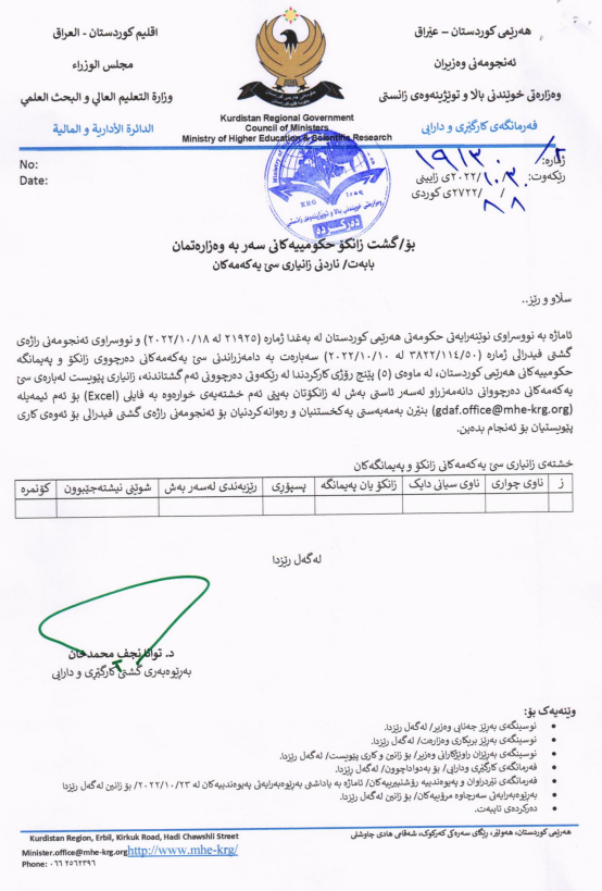 لە ئێستاشدا بەشە جیاوازەکانی زانکۆ و پەیمانگاکانی هەرێم بە نووسراوی فەرمی داوایان لێکراوە ناو و زانیاری تەواو بنێرین بۆ وەزارەتی دارایی و بۆ ئەو مەبەستەش داوا لە خوێندکاران دەکەن، بە زووترین کات بەدەم داواکارییەکەوە بچن بۆ پڕکردنەوەی فۆڕم.