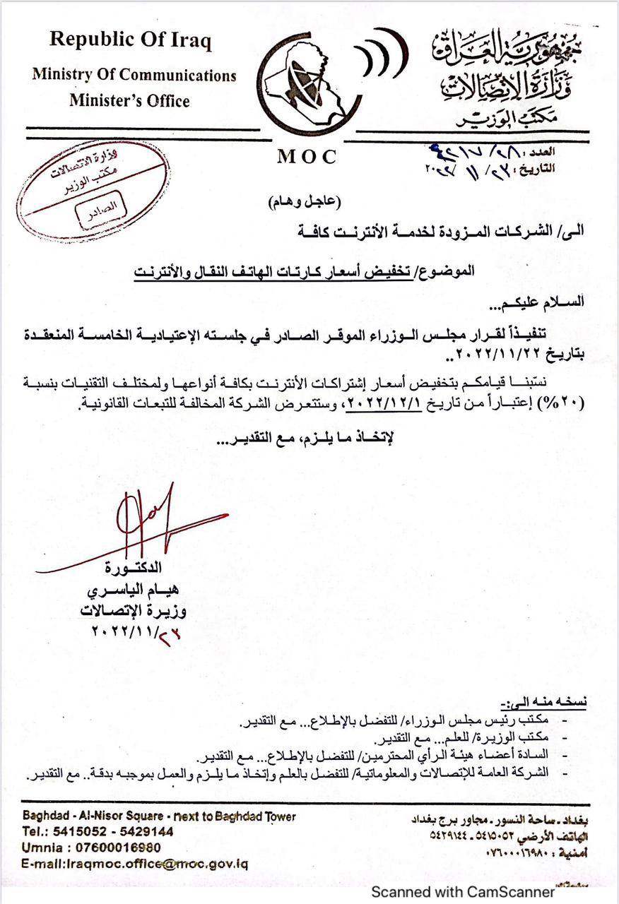 ئەمڕۆ یەکشەممە بە گوێرەی نوسراوێکی وەزارەتی پەیوەندییەکانی عێراق کە واژووی هەیام یاسری وەزیری پەیوەندییەکانی عێراقی لەسەرە، تێیدا هاتووە، داواکارییەکی فەرمی لە وەزارەتی پەیوەندی عێراقەوە ئاڕاستەی سەرجەم کۆمپانیاکانی ئینتەرنێت کراوە بۆ هەڵگرتنی ٢٠٪ی باجی کرێی پڕکردنەوەی ئینتەرنێت لە یەکی مانگی کانونی یەکەمەوە.
