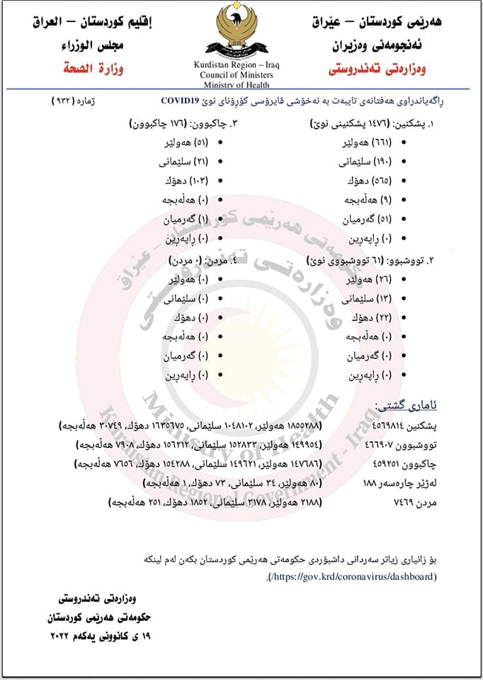 وەزارەتی تەندروستی حکومەتی هەرێمی کوردستان ئاماری هەفتانەی کۆرۆنا لە هەرێم بڵاوکردەوەو ڕایگەیاند لەم هەفتەیەدا 61 توشبو و 176 چاکبونەوە هەبووە.