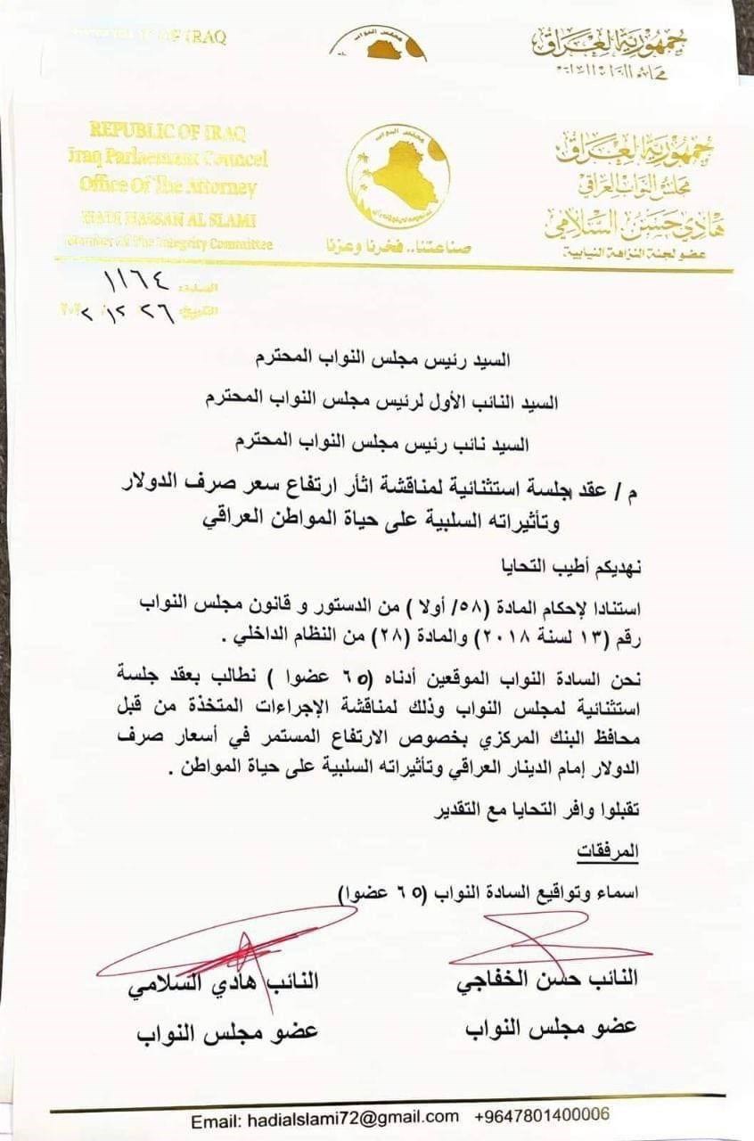 بەپێی نوسراوێك، بەشێك لەپەرلەمانتارانی عێراق كەژمارەیان ٦٥ پەرلەمانتارە واژۆیان كۆكردوەتەوە و ئاراستەی سەرۆكاییەتی پەرلەمانیان كردوە، بەمەبەستی ئەنجامدانی كۆبونەوەیەكی تایبەت لەسەر بەرز بونەوەی بەهای دۆلاری ئەمریكی بەرامبەر دیناری عێراق وداوای گرتنەبەری ڕێوشوێنی گونجاو دەكەن بەرامبەر بانكی ناوەندن، هەروەها دەشڵێن بەرزبوونەوەی بەهای دۆلار كاریگەری نەرێنی لەسەر ژیانی هاوڵاتیان دەبێت.