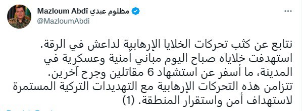 مەزلۆم کۆبانێ فەرماندەی گشتی هێزەکانی سوریای دیموکراتی (هەسەدە)، تویتێکی لەبارەی زیانە گیانیەکانی هێرشەکەی تیرۆریستانی داعش بۆ سەر ناوەندی ئاسایشی شاری رەقا بڵاوکردەوە.