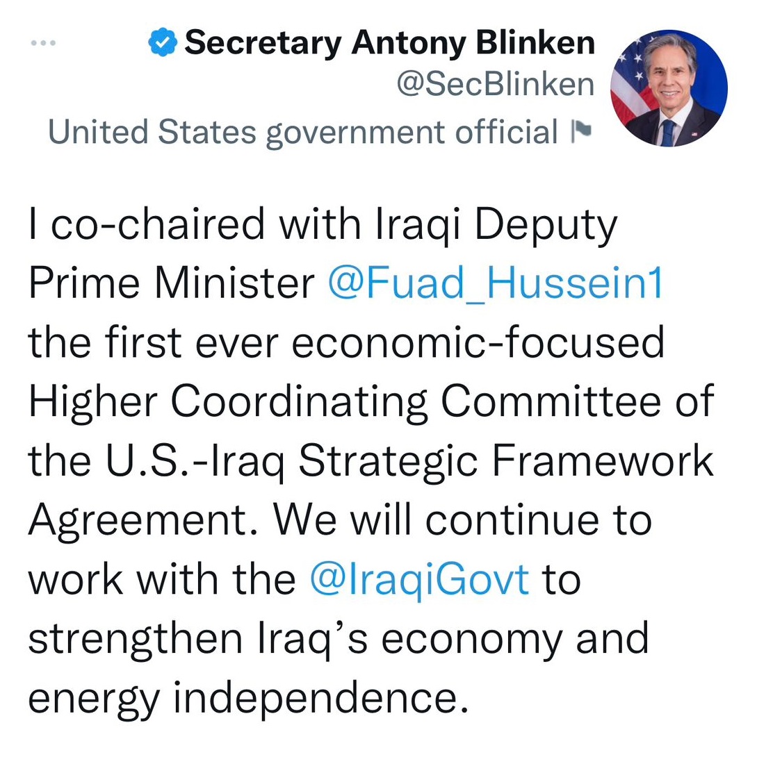 ههروهها بلینكن نووسیوویهتی: "پێكهوه لهپێناو بههێزكردنی پهیوهندییهكانمان لهگهڵ حكومهتی عێراق له بواری ئابووری و سهربهخۆیی وزه، كاردهكهین".