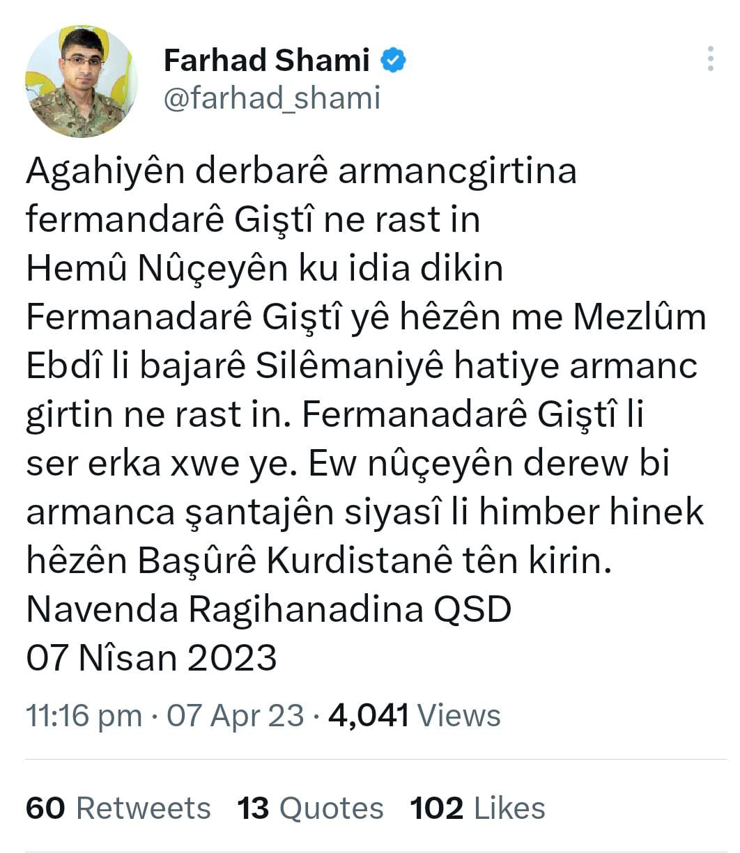 لە ڕاگەیەنراوێکدا فەرهاد شامی دەڵێت: هەموو ئەو هەواڵانەی کە دەڵێن فەرماندەی گشتی هێزەکانمان مەزڵوم عەبدی لە سلێمانی کراوەتە ئامانج ڕاست نییە.