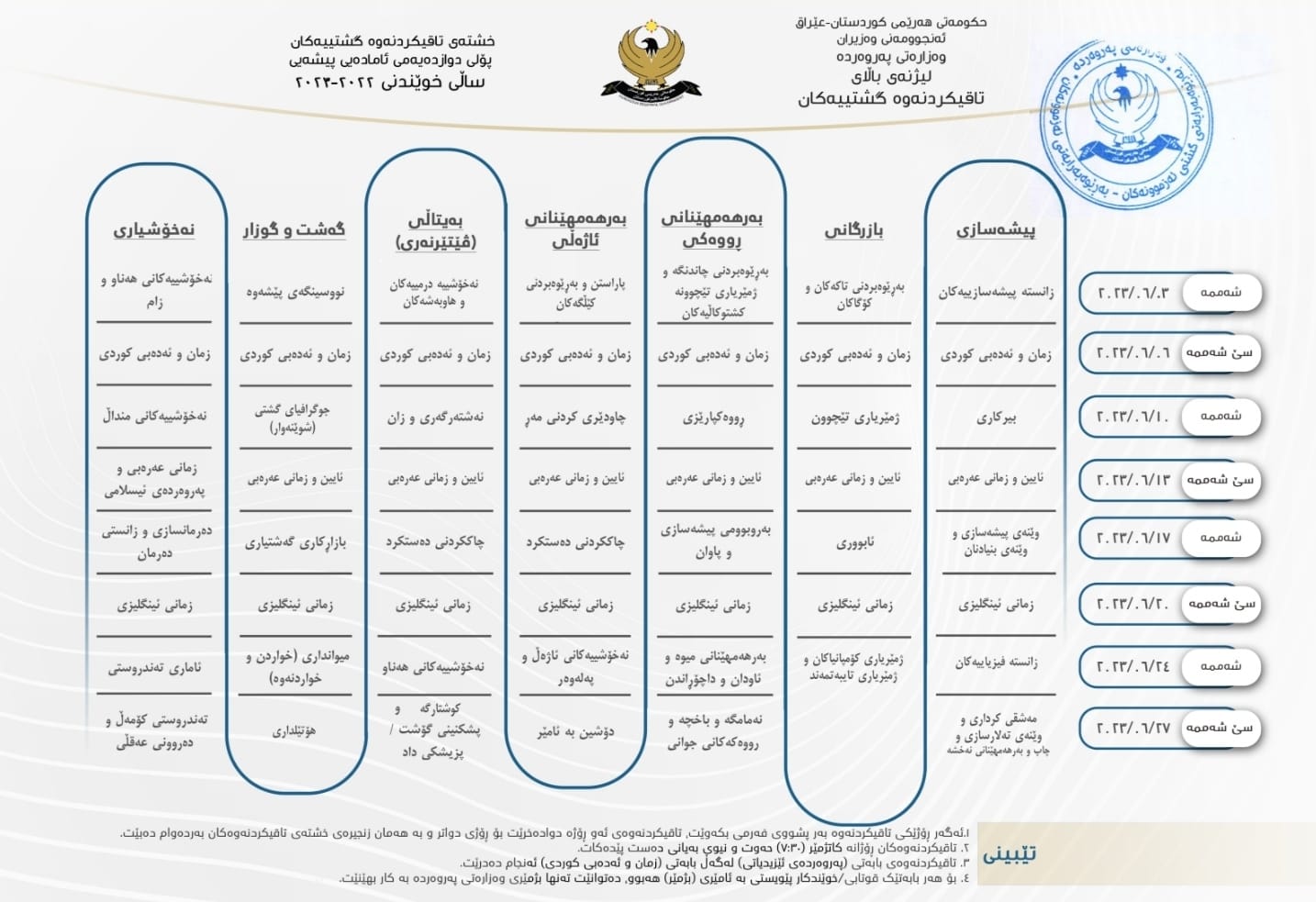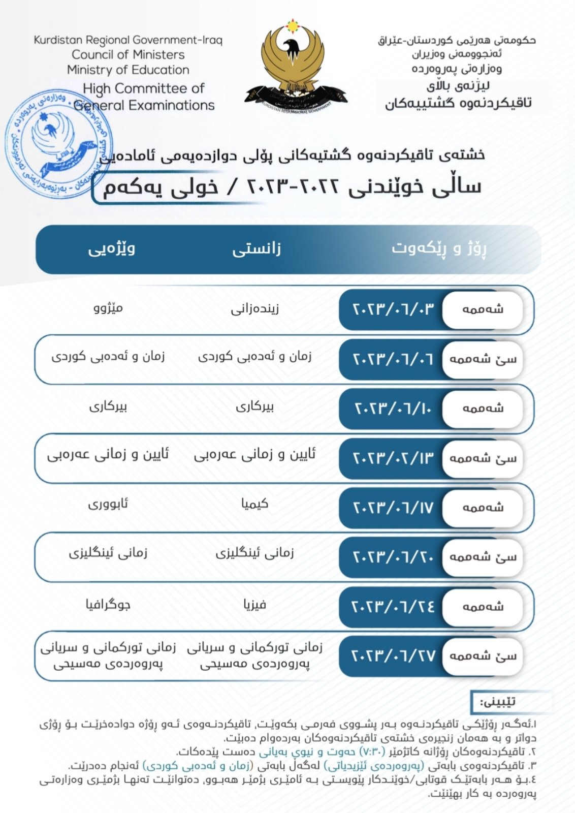بەگوێرەی خشتەیەک کە وەزارەتی پەروەردەی هەرێمی کوردستان بڵاویکردووەتەوە، تاقیکردنەوەکانی پۆلی 12ـی ئامادەیی رۆژی 03-06-2023 بە وانەی زیندەزانی لە بەشی زانستی و وانەی مێژوو لە بەشی وێژەیی دەست پێدەکەن.