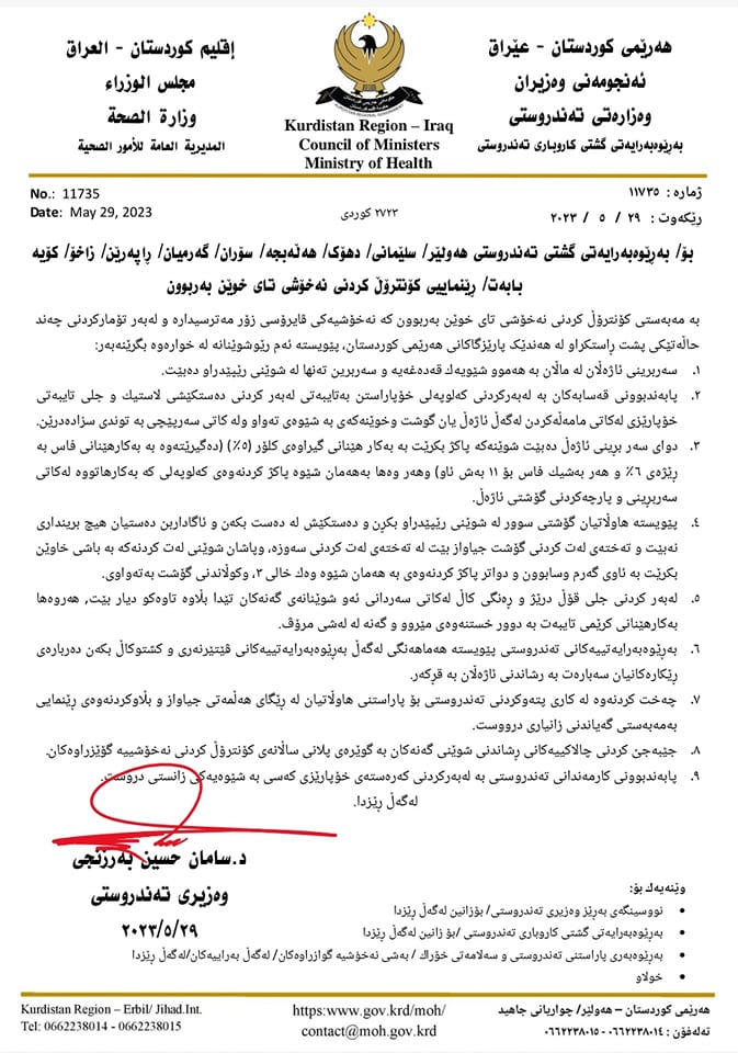 وەزارەتی تەندروستی بۆ کۆنتڕۆڵکردنی نەخۆشی تای خوێنبەربون رێنمایی نوێی دەرکرد و دەڵێت، سەربڕینی ئاژەڵ لەماڵان بەهەمو شێوەیەک قەدەغەیە و سەربڕین تەنها لە شوێنی رێپێدراو دەبێت، هەروەها پێویستە هاوڵاتیان گۆشت لە شوێنی رێپێدراو بکڕن و دەستکێش لە دەستبکەن.