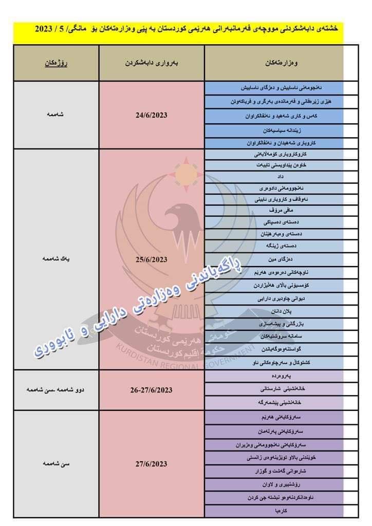بەگوێرەی ئەو لیستەی کە ئەمڕۆ هەینی، 23-06-2023، وەزارەتی دارایی هەرێمی کوردستان بڵاویکردەوە؛ تاوەکو رۆژی 27-06-2023، مووچەی سەرجەم وەزارەتەکان دابەش دەکرێت.