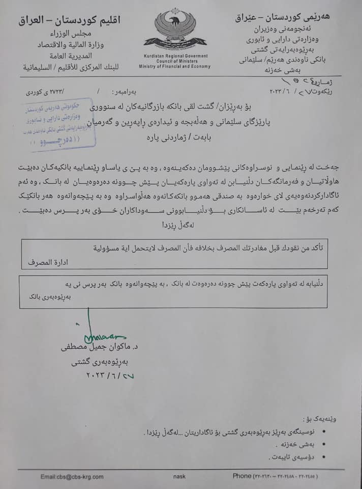 بەڕێوەبەری گشتی بانکی ناوەندی لە سلێمانی لەنوسراوێکدا کە ئاڕاستەی سەرجەم لقی بانکە بازرگانیەکانی سنوری سلێمانی و هەڵەبجە و هەردو ئیدارەی گەرمیان و راپەڕینی کردوە تێیدا هاتوە، بەپێی یاسا و رێنماییە بانکیەکان دەبێت هاوڵاتیان و فەرمانگەکان دڵنیابن لەتەواوی پارەکەیان پێش چونە دەرەوەیان لە بانک، ئەم ئاگاداریەش بەسندوقی بانکەکانەوە هەڵواسراوە و بەپێچەوانەوە هەر بانکێک کەمتەرخەم بێت لەئاسانکاری بۆ دڵنیابونی سەوداکاران، خۆی بەرپرس دەبێت.