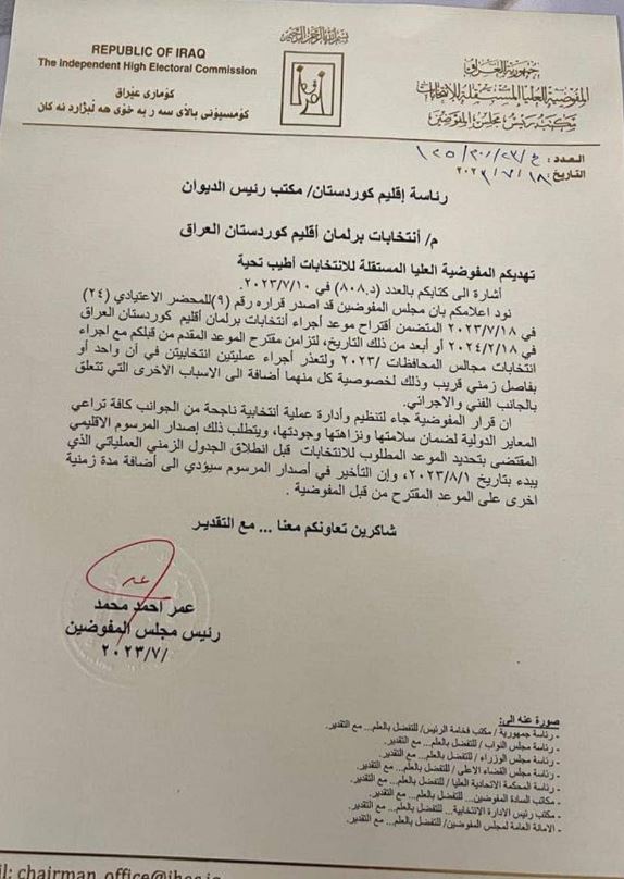 بەپێی ئەو نوسراوەی كۆمسیۆن كە واژۆی عومەر ئەحمەد سەرۆكی ئەنجومەنی كۆمسیارانی لەسەرە و ئاڕاستەی سەرۆكایەتی هەرێم كراوە، پێشنیاز كراوە هەڵبژاردنی پەرلەمانی كوردستان لەرێكەوتی 18ی شوباتی 2024 بەرێوەبچێت یاخود دواتر.