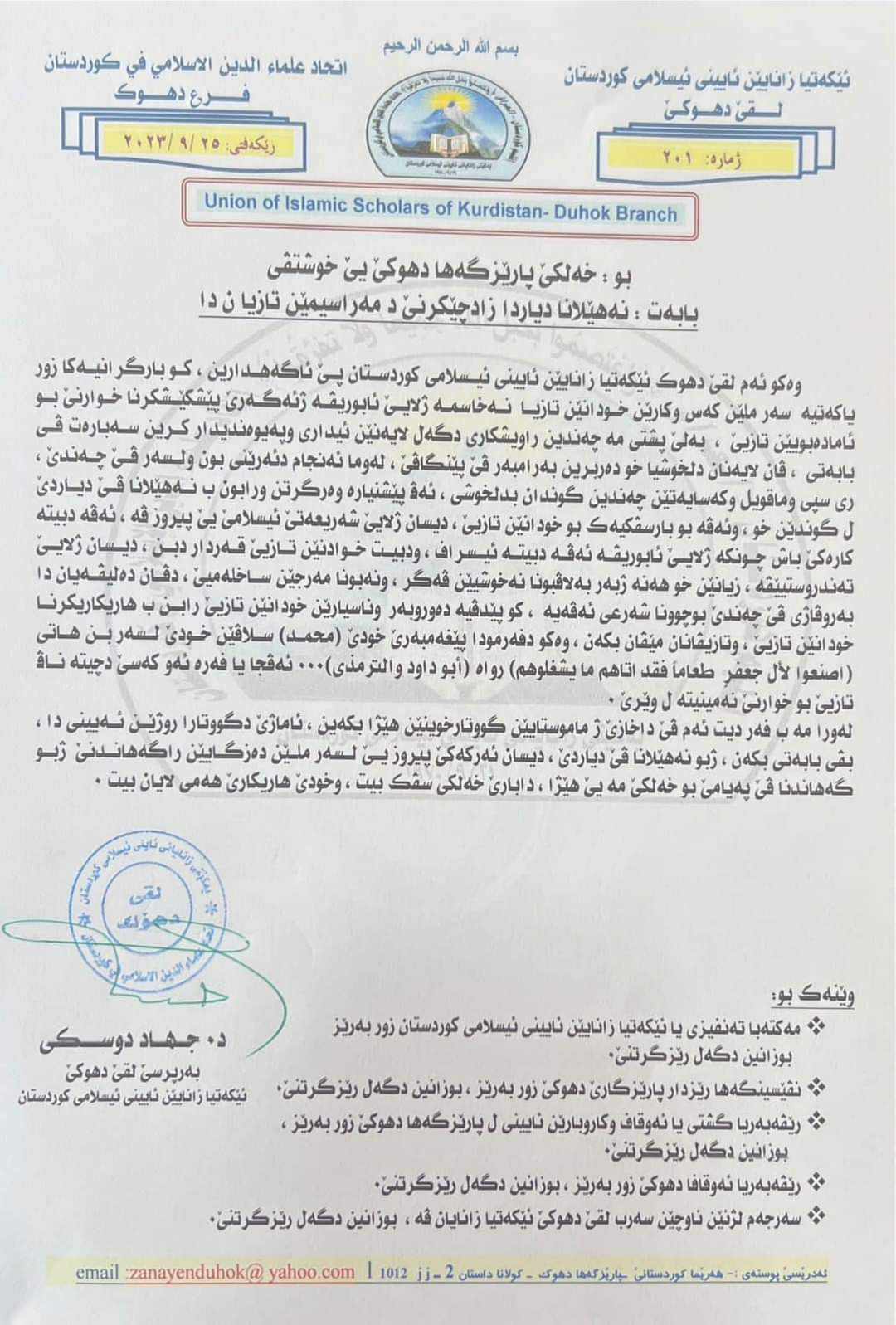 ئەمرۆ 25ی ی ئەیلول، لقی دهۆکی یەکێتی زانایانی کوردستان بەرێگای نوسراوێکی فەرمی داوا لە ووتاربێژانی ئایینی دەکات کە هانی خەڵک بدەن چیتر لە پرسەدا خواردن دروست نەکەن چونکە دەبێتە بارگرانیەکی زۆر لەسەر خاوەنی پرسە. نوسراوە فەرمییەکە ئاراستەی پارێزگاری دهۆک و وەزارەتی ئەقاف کراوە کە ئەو دیاردەیە قەدەغە بکرێت.