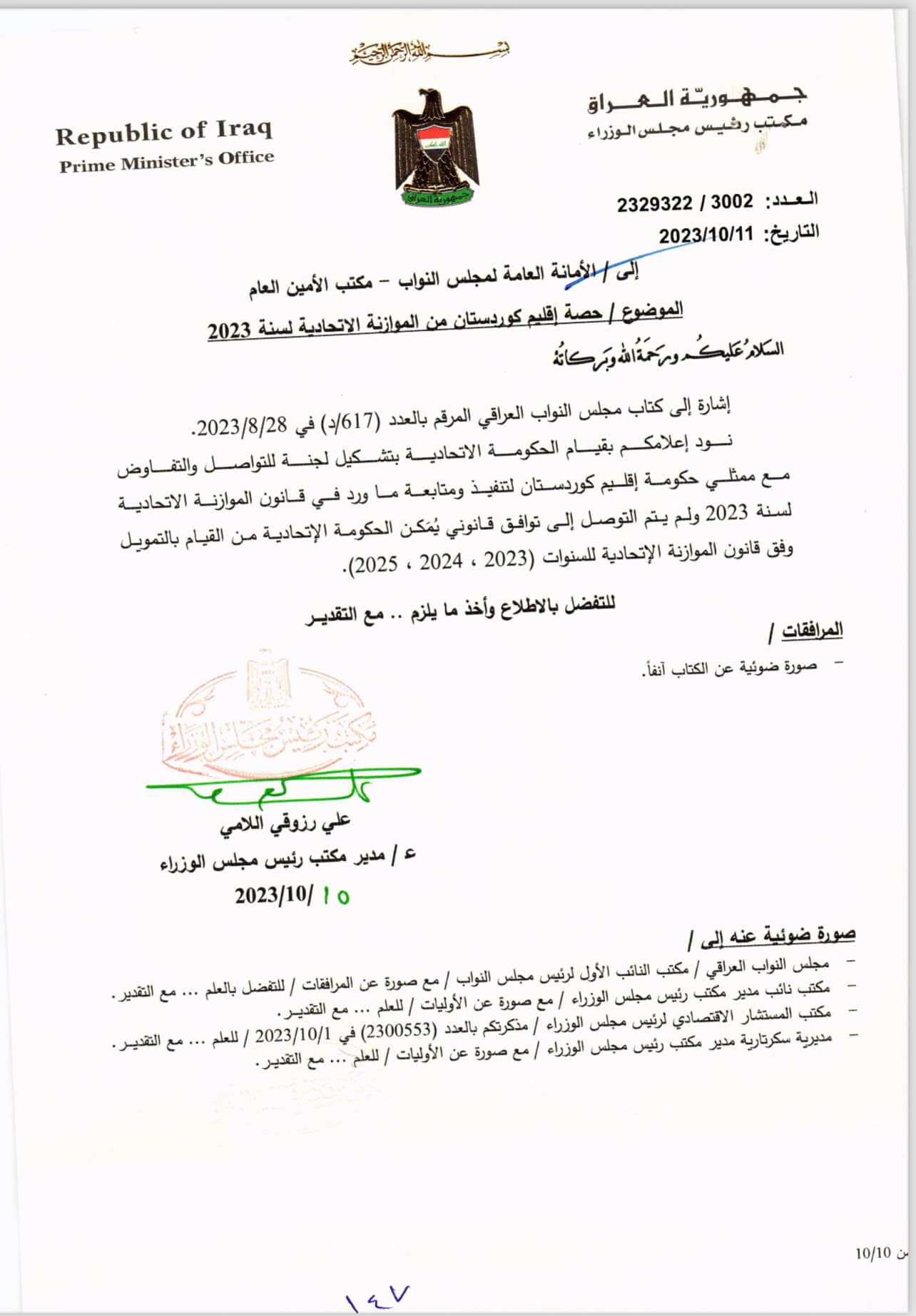 نوسینگهی محهمهد شیاع سودانی سهرۆك وهزیرانی عێراق ڕایدهگهیهنێت، تاوهكو ئێستا لهگهڵ لیژنهكهی حكومهتی ههرێم نهگهیشتون به رێكهوتنی یاسایی بۆیه حكومهتی فیدڕاڵی ههڵنهساوه به ناردنی پاره بۆ ههرێمی كوردستان بهپێی یاسای بودجهی ساڵانی 2023-2024-2025.