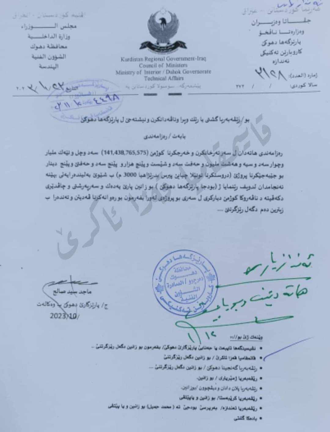 بەپێی نوسراوەکە کە واژۆی جێگری پارێزگای دهۆکی لەسەرە، تێچووی پرۆژەکە 141 ملیار و 438 ملیۆن و 765هەزار و 575 دینارە کەلەسەر بودجەی پارێزگای دهۆک دروست دەکرێت.