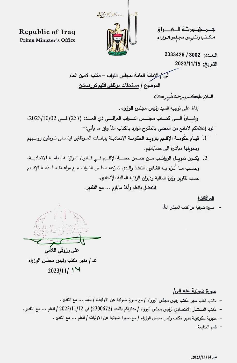 بە پێی نوسراوێك كە لە رۆژی 13/11/2023 نوسینگەی سەرۆك وەزیرانی عێراق ئاراستەی ئەمینداری گشتی ئەنجومەنی نوێنەرانی عێراقی كردووە سەبارەت بە موچەی موچەخۆرانی هەرێمی كوردستان هاتووە: سەرۆك وەزیرانی عێراق رەزامەندە لەسەر ئەوەی ئەگەر حكومەتی هەرێمی كوردستان لیستی موچەو زانیاری فەرمانبەرانی هەرێم بداتە حكومەتی عێراق ئەوا حكومەتی عێراق راستەوخۆ موچە دەخاتە سەر هەژماری بانكی موچەخۆرانی هەرێم.