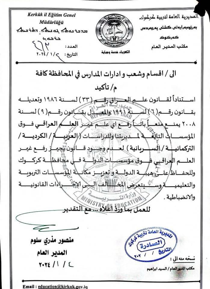 ئەمڕۆ پێنجشەممە، بەڕێوەبەرایەتی پەروەردەی کەرکوک نوسراوێکی ئاڕاستەی دەستەی کارگێڕی قوتابخانەکانی کوردی و تورکمانی و سریانی و عەرەبی کردووە کە واژووی مەنسور مزری مەلوم بەڕیوەبەری پەروەردەی کەرکوکی پێوەیە ئاماژەی بەوە کردووە، هیچ یاسایەک نییە پاڵپشتی هەڵکردنی هیچ ئاڵایەکی دیکە بکات جگە لە ئاڵای عێراق.